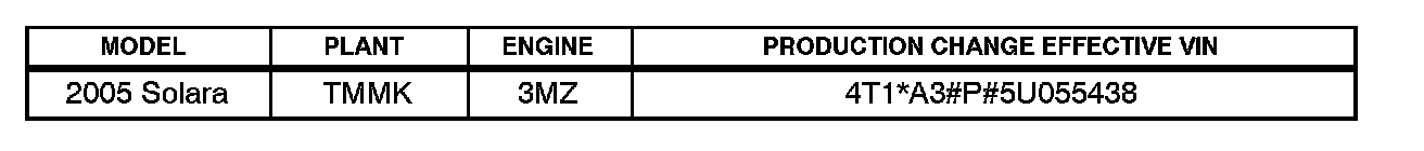 ^ 2005 model year Solara vehicles equipped with 3MZ-FE engine produced BEFORE the Production Change Effective VINs shown below.