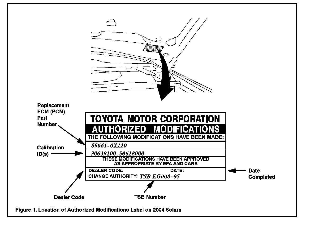 2. Check for the Authorized Modifications Label affixed to the vehicle in the location shown in Figure 1. Confirm if ECM (PCM) calibration has been updated. If not the latest ECM (PCM) calibration go to step 3.