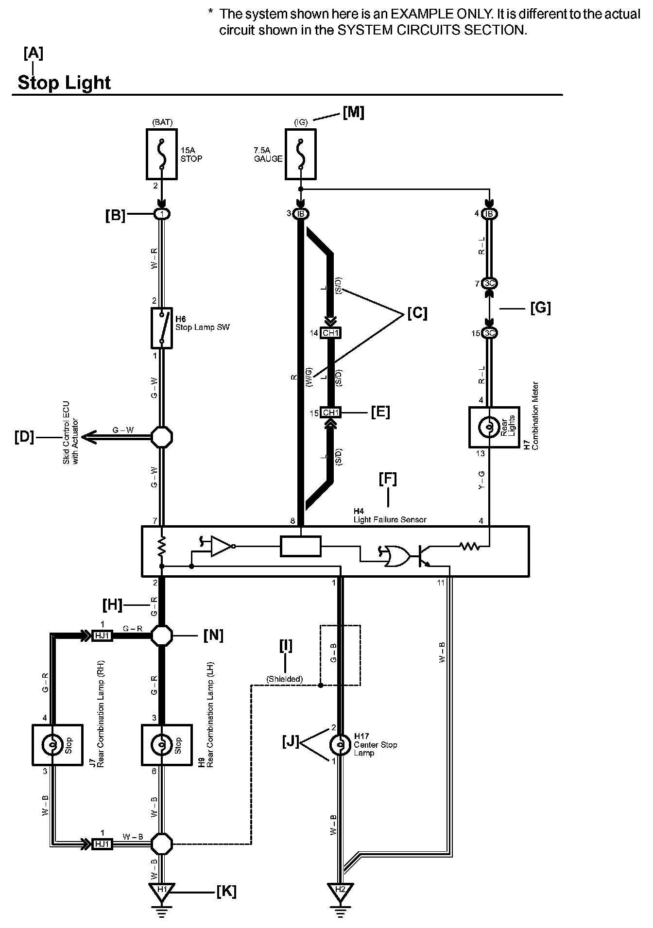 When the ignition SW is turned on and the brake pedal is pressed (Stop lamp SW on), if the stop light circuit is open, the current flowing from TERMINAL 7 of the light failure sensor to TERMINALS 1, 2 changes, so the light failure sensor detects the disconnection and the warning circuit of the light failure sensor is activated.