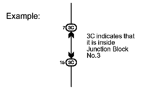 E: Indicates the code for the (male and female) connectors which are used to join two wire harnesses. The connector code consists of two alphabetical and one numerical characters.
