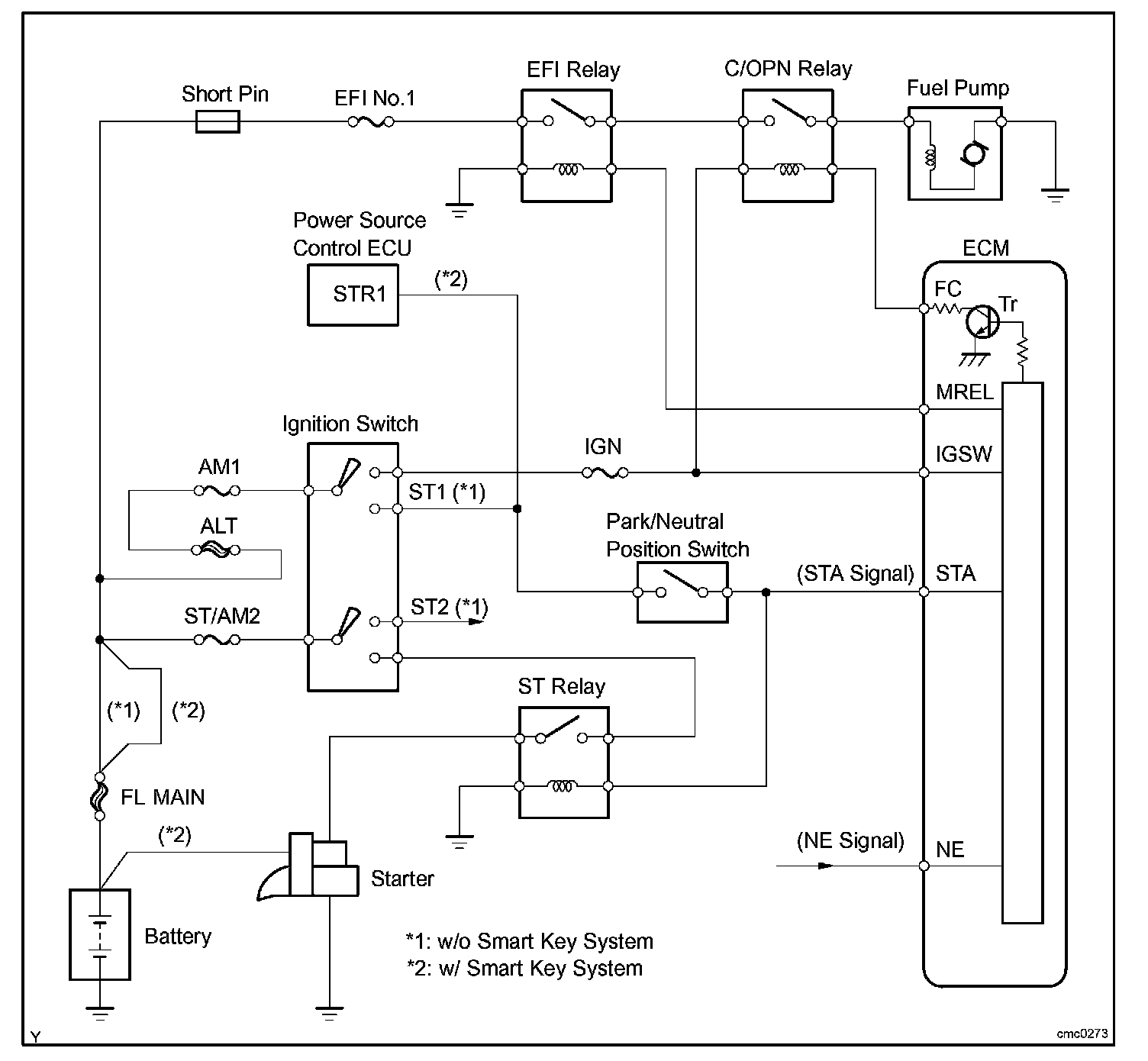In the diagram, when the engine is cranked, current flows from terminal ST1 (STR1) of the ignition switch (power source control ECU) to the starter relay (Marking: ST) coil and also current flows to terminal STA of ECM (STA signal).