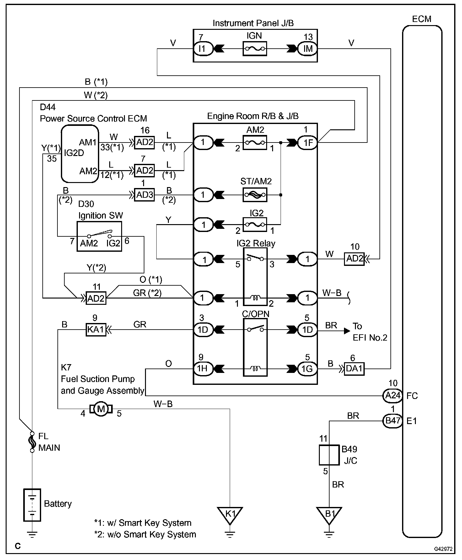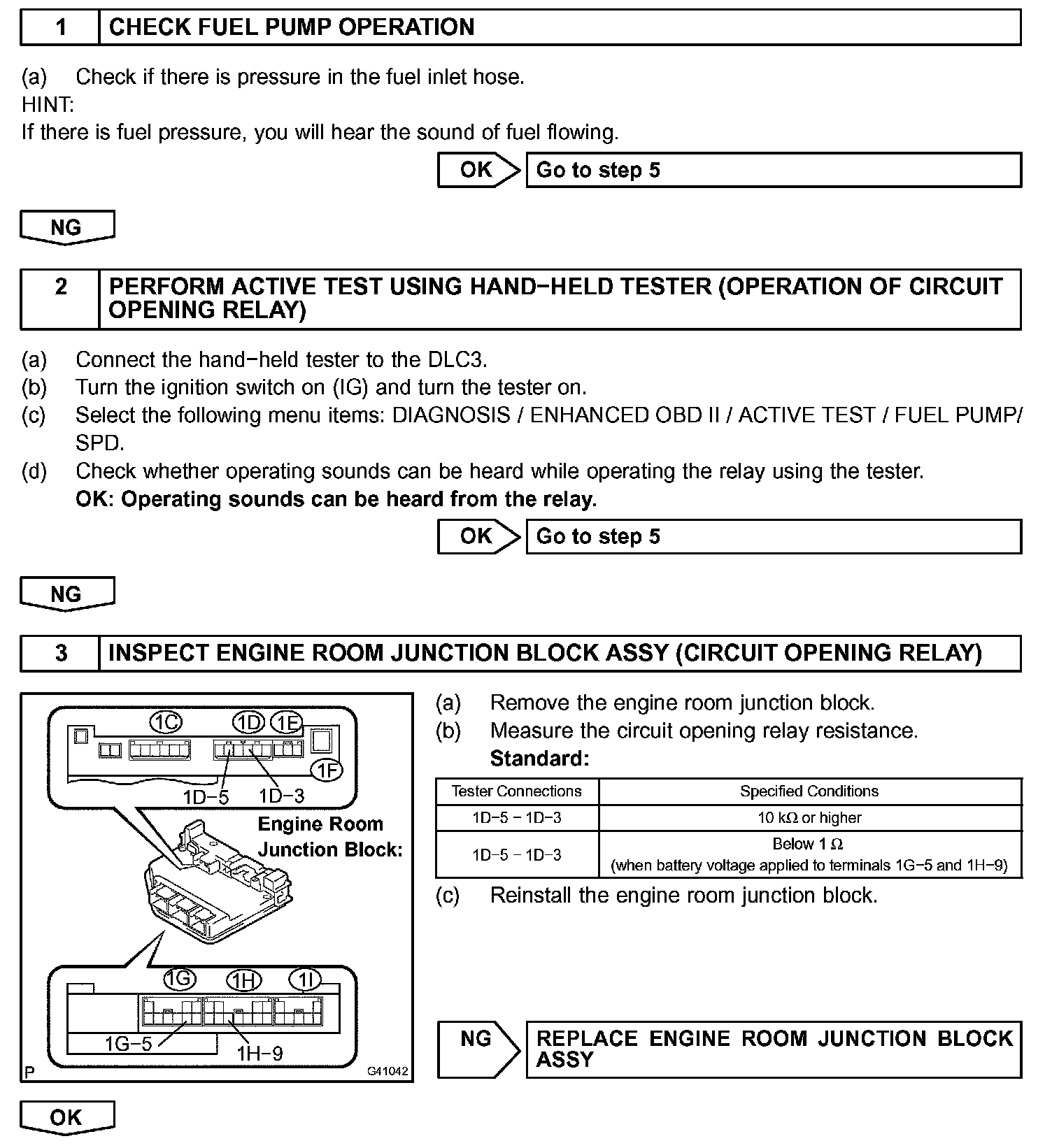 When the STA signal and NE signal are input to the ECM, Tr is turned ON, current flows to coil of the circuit opening relay (Marking: C/OPN), the relay switches on, power is supplied to the fuel pump and the fuel pump operates.