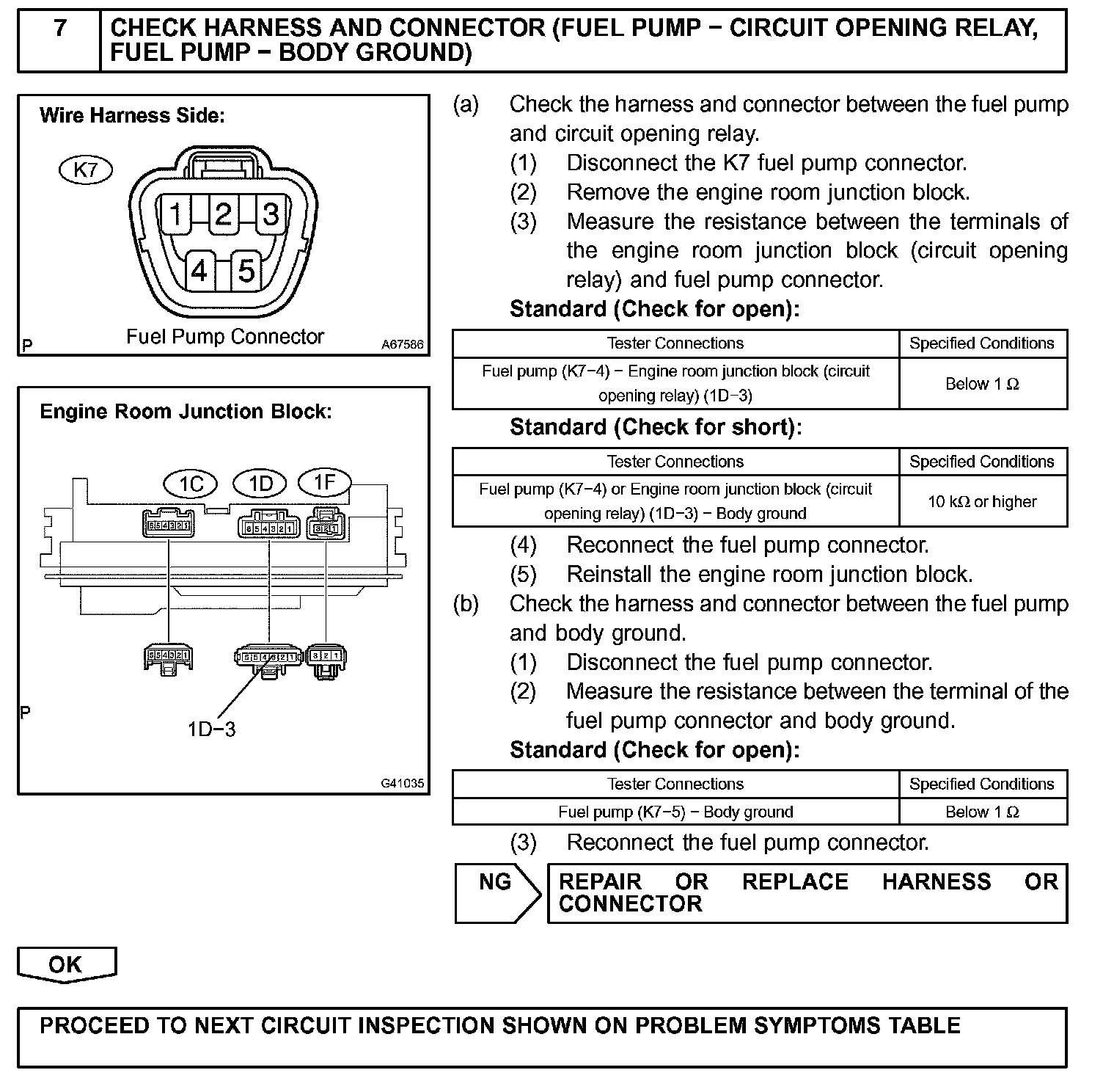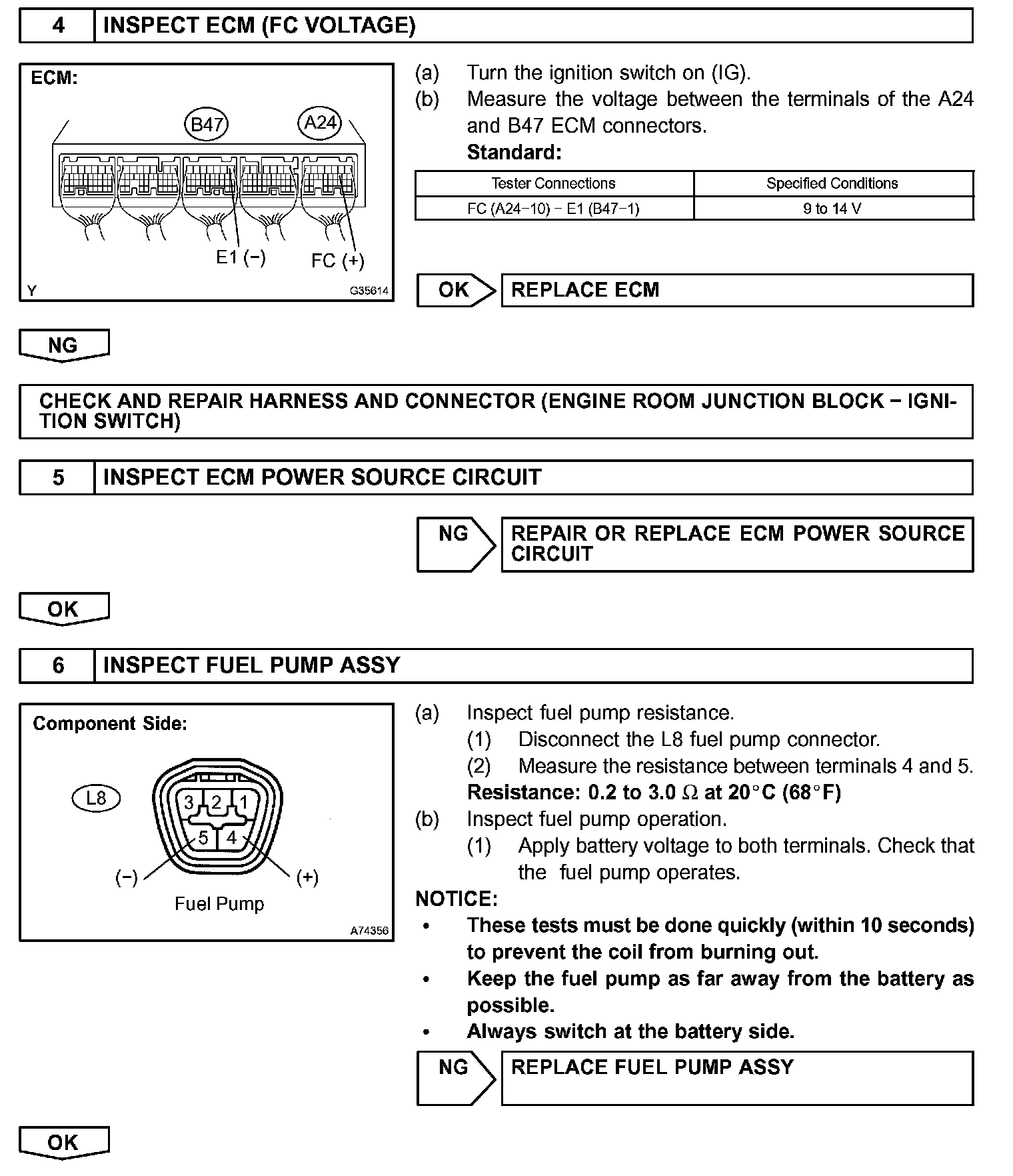 While the NE signal is generated (engine running), the ECM keeps Tr ON (circuit opening relay ON) and the fuel pump also keeps operating.