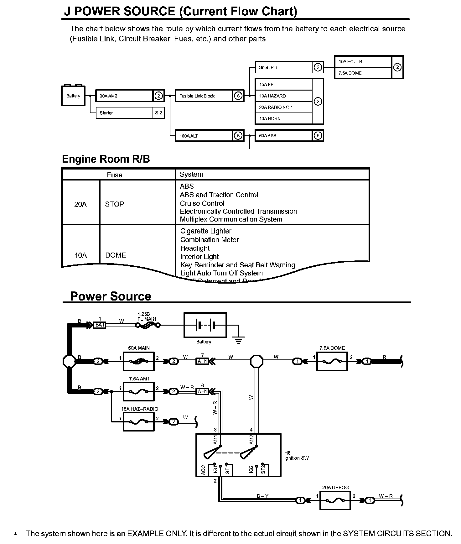 The "Current Flow Chart", describes which parts each power source (fuses, fusible links, and circuit breakers) transmits current to. In the Power Source circuit diagram, the conditions when battery power is supplied to each system are explained. Since all System Circuit diagrams start from the power source, the power source system must be fully understood.