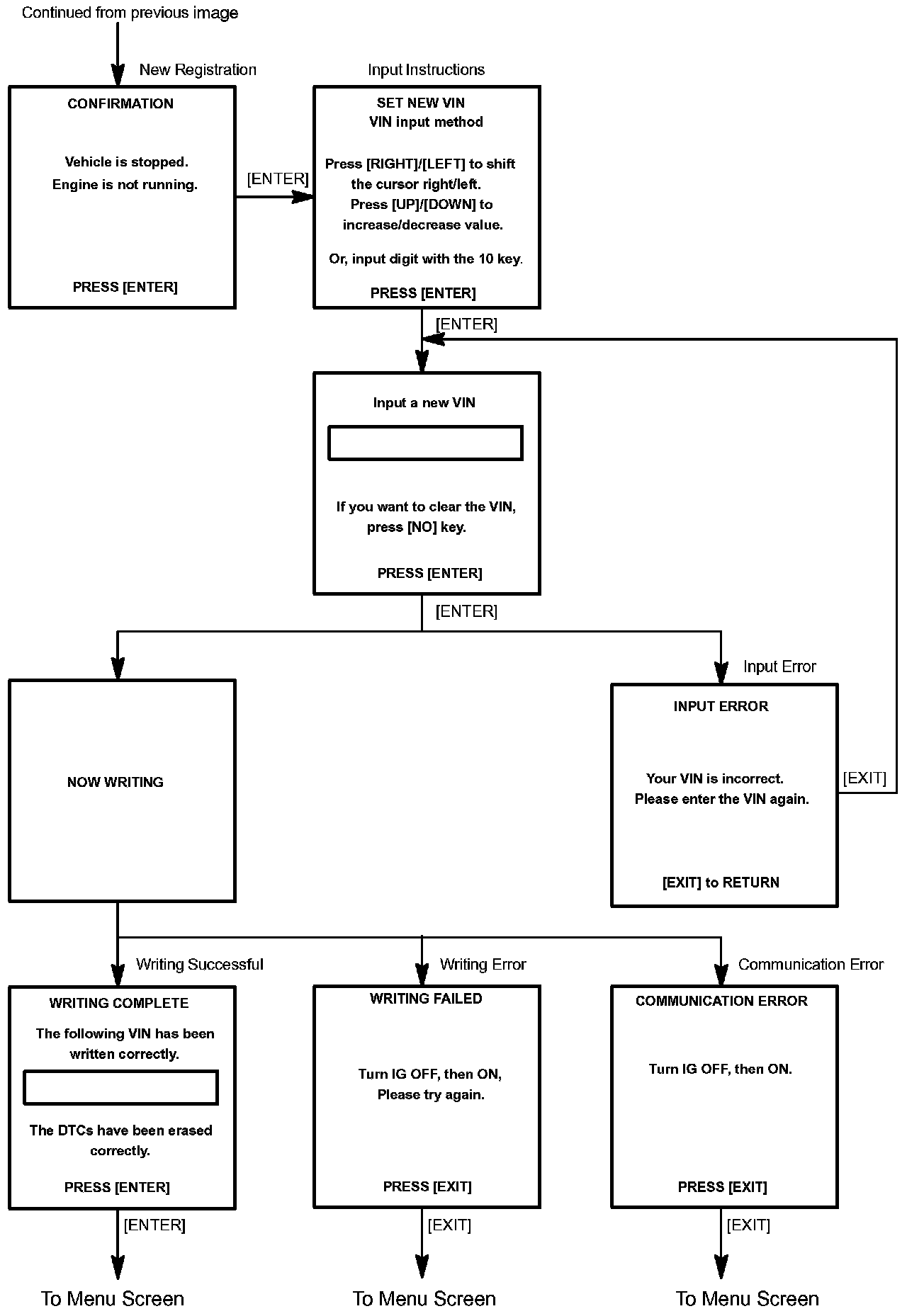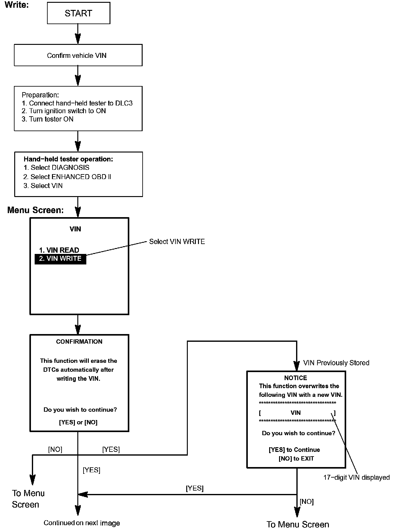 c. Write VIN: Explains the VIN writing process in a flowchart. This process allows the VIN to be input into the ECM. If the ECM is changed, or the VIN and VIN do not match, the VIN can be registered, or overwritten in the ECM by following this procedure.