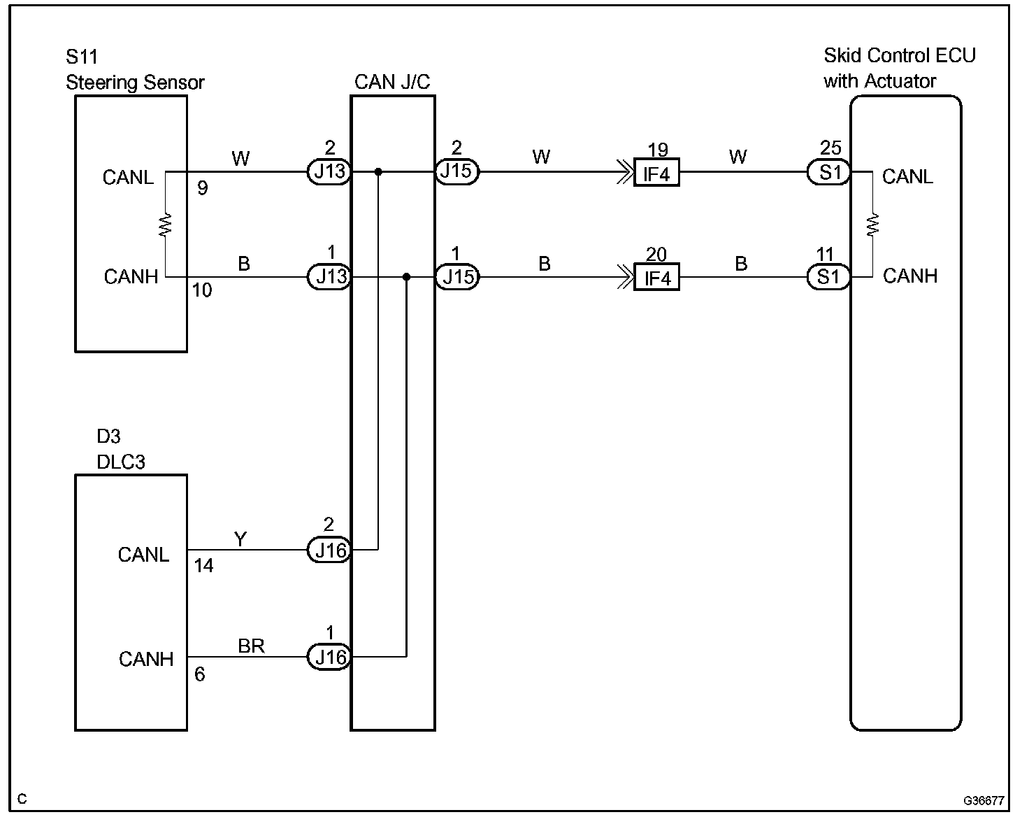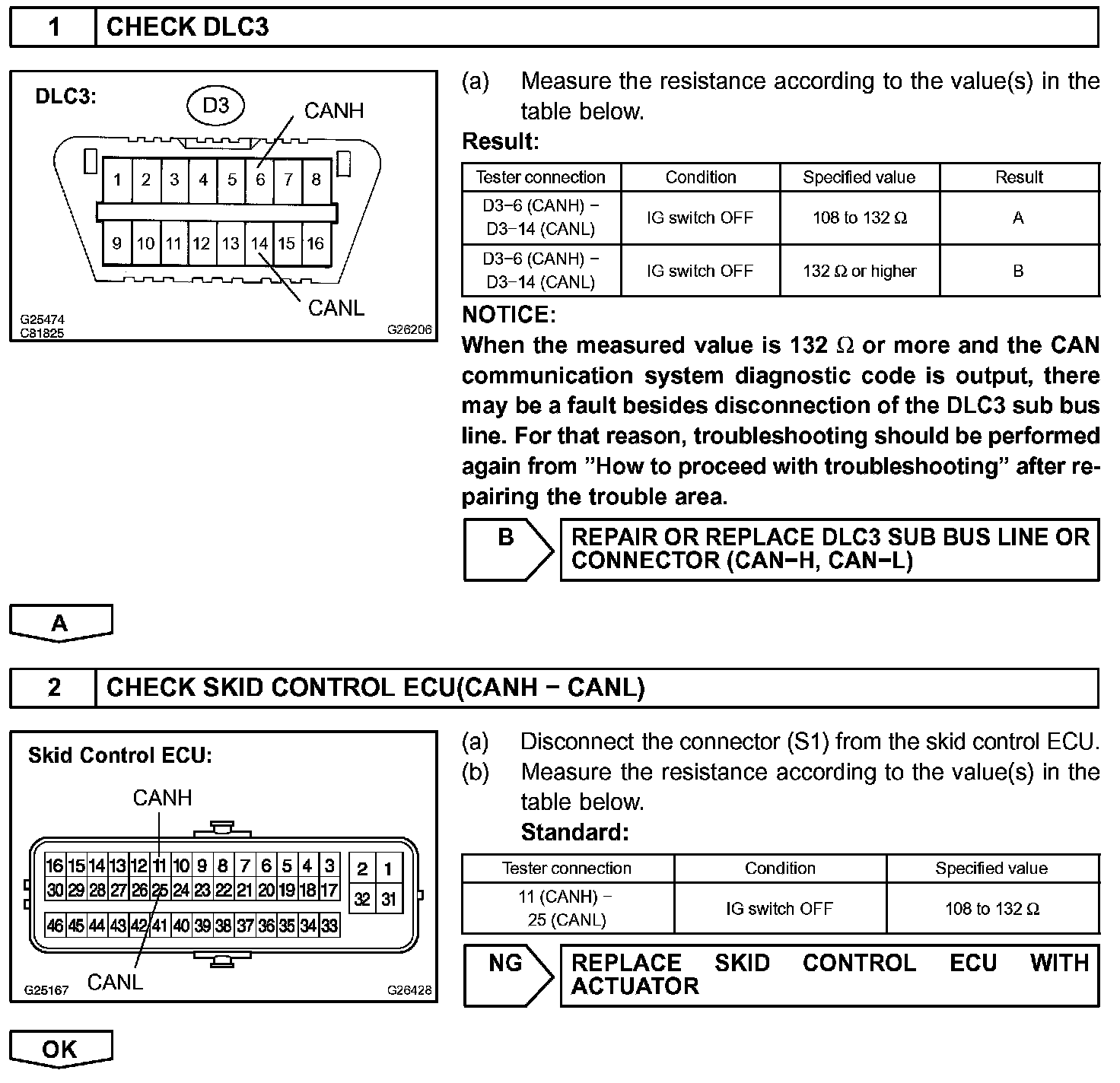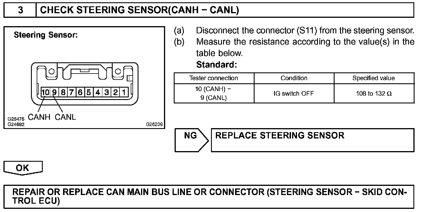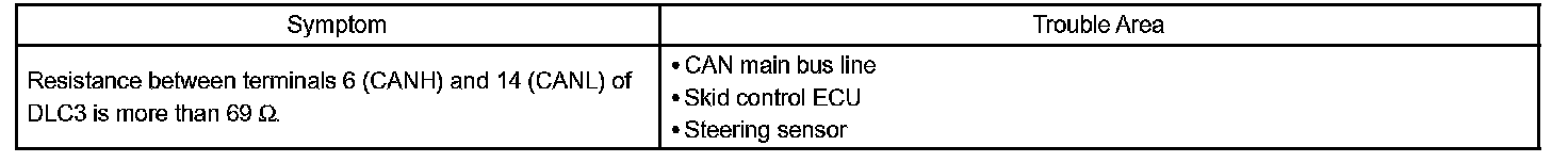 The CAN main bus line and DLC3 sub bus line may have a disconnection when the resistance between terminals 6 (CANH) and 14 (CANL) of the DLC3 is more than 69 Ohms.
