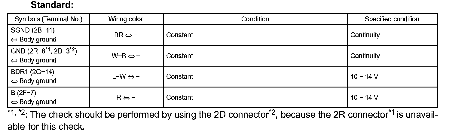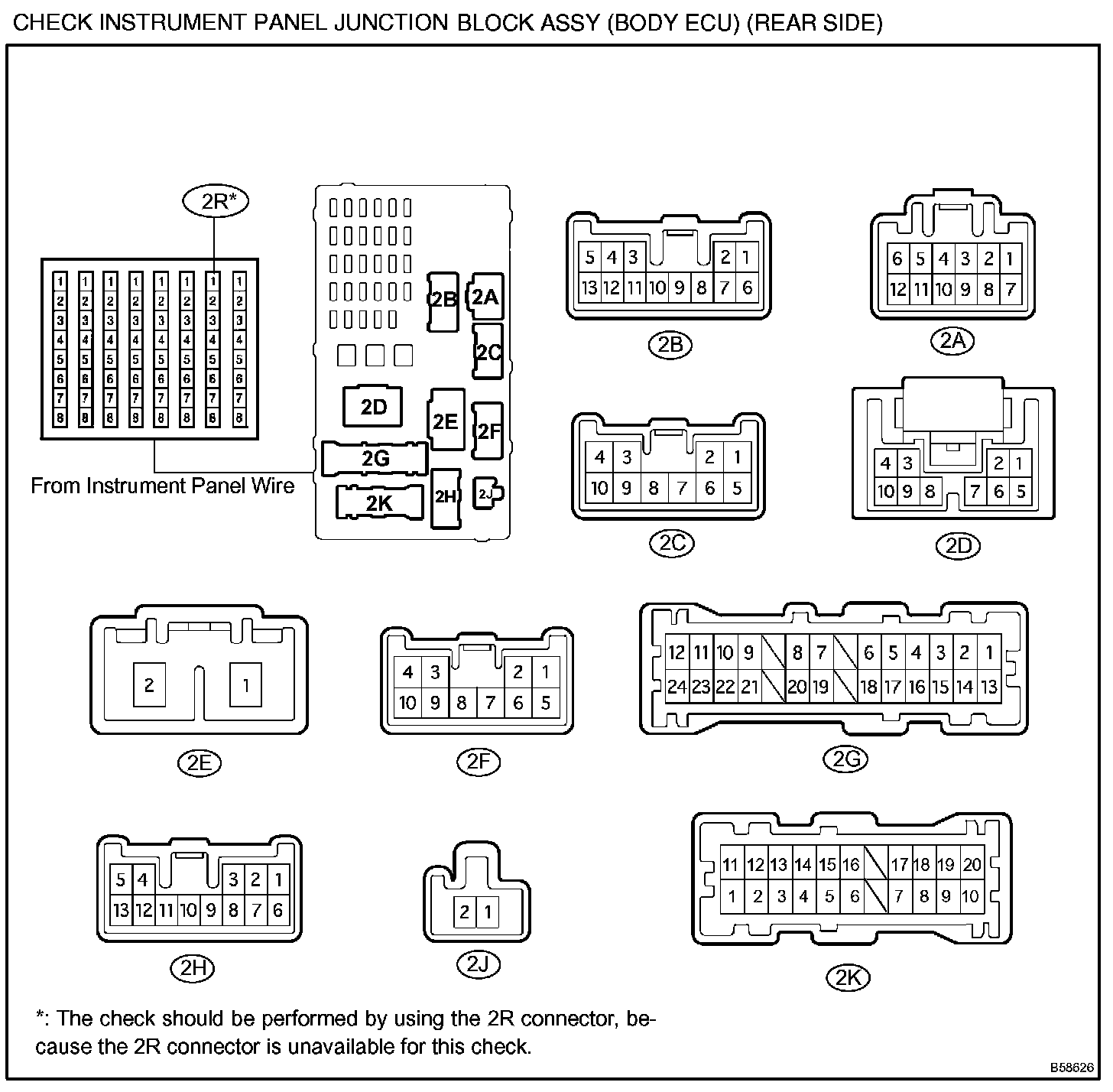 a. Disconnect the 2B, 2F and 2G instrument panel J/B connectors, and check the continuity and voltage of each terminal of the disconnected connectors.