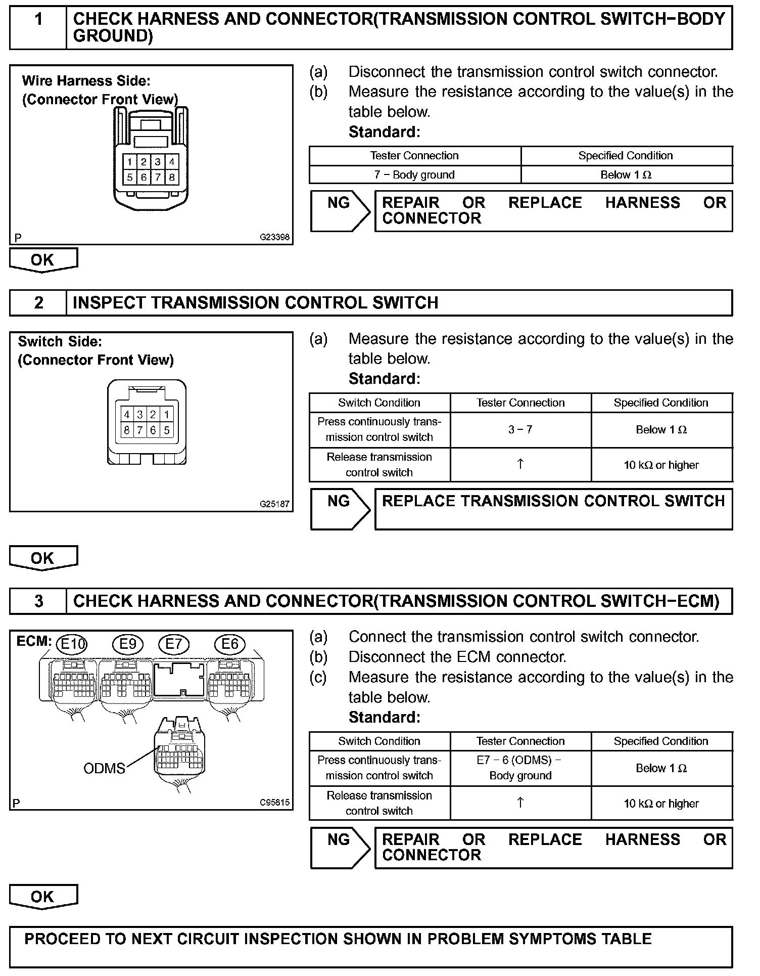 The O/D main switch (transmission control switch) is a momentary type switch. When pressing the O/D main switch, the O/D OFF indicator light lights up and the ECM prohibits shifting into O/D, and when pressing it once again, the O/D OFF indicator light goes off and the ECM allows shifting into O/D. Turning the IG switch OFF will reset the O/D OFF indicator light.