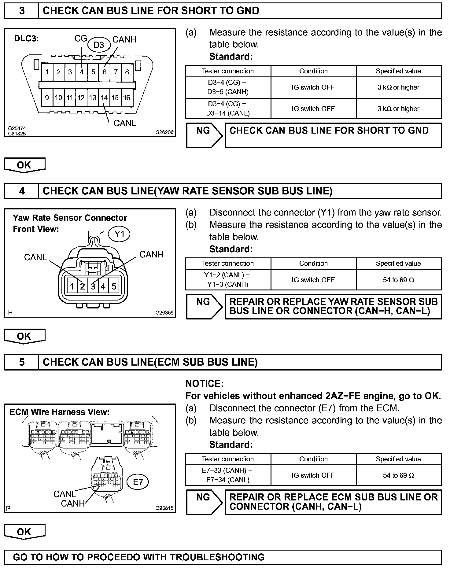 When any DTC for the CAN communication is output, first measure the resistance between the terminals of the DLC3 and the yaw rate sensor connector to specify the trouble area.