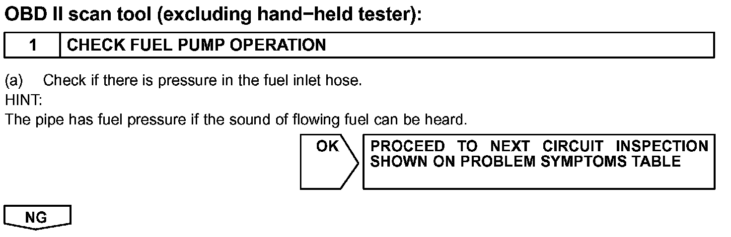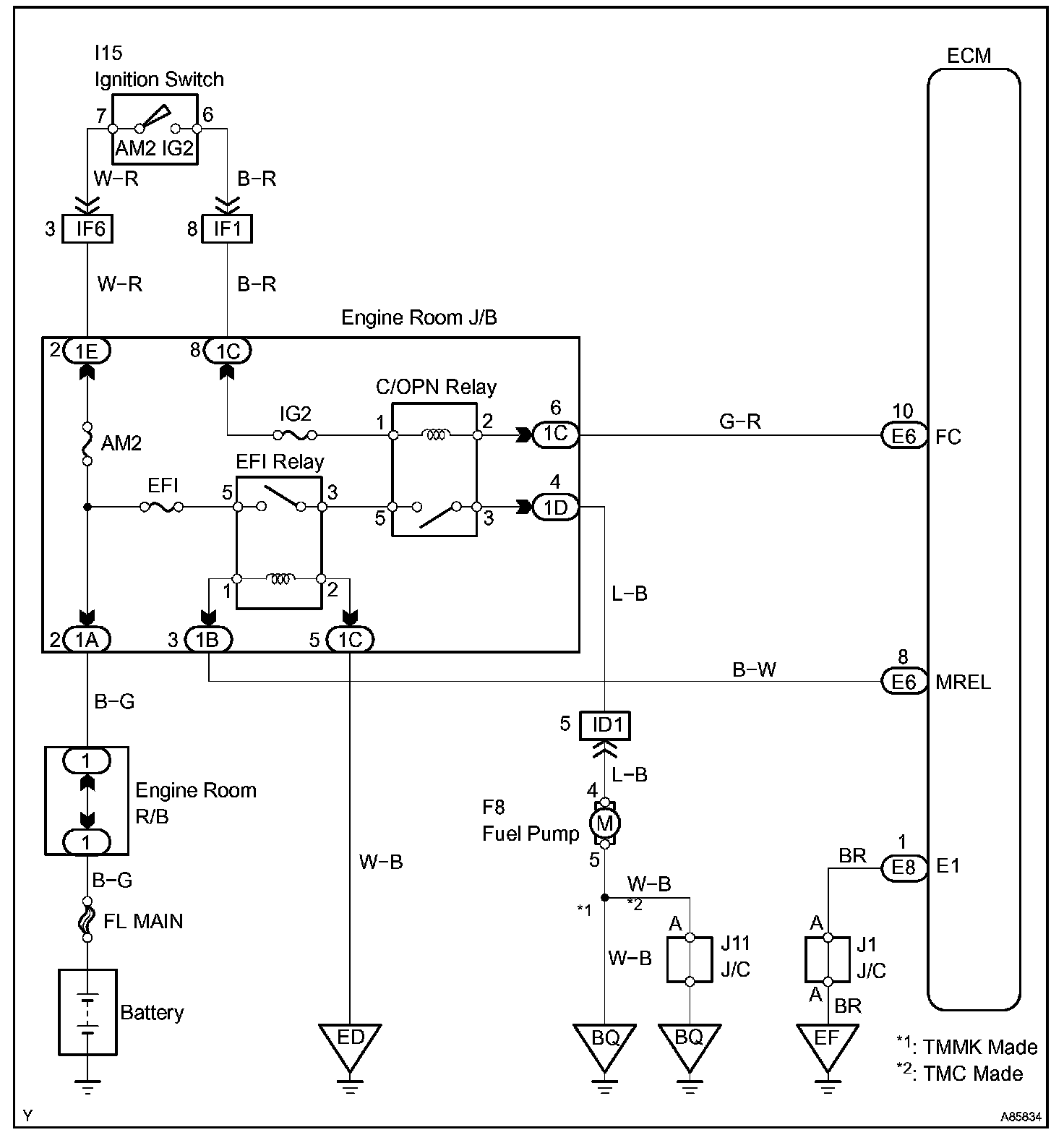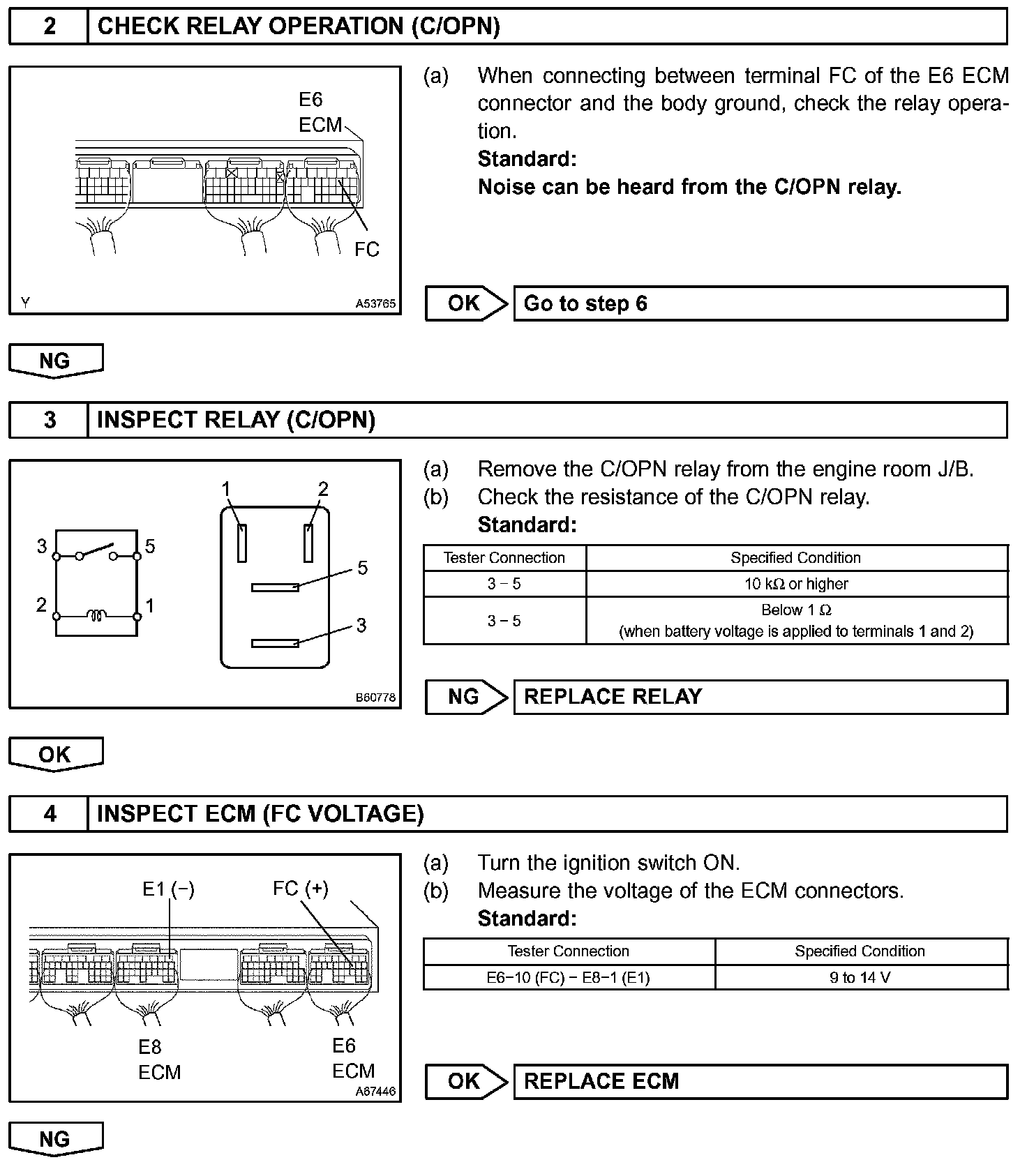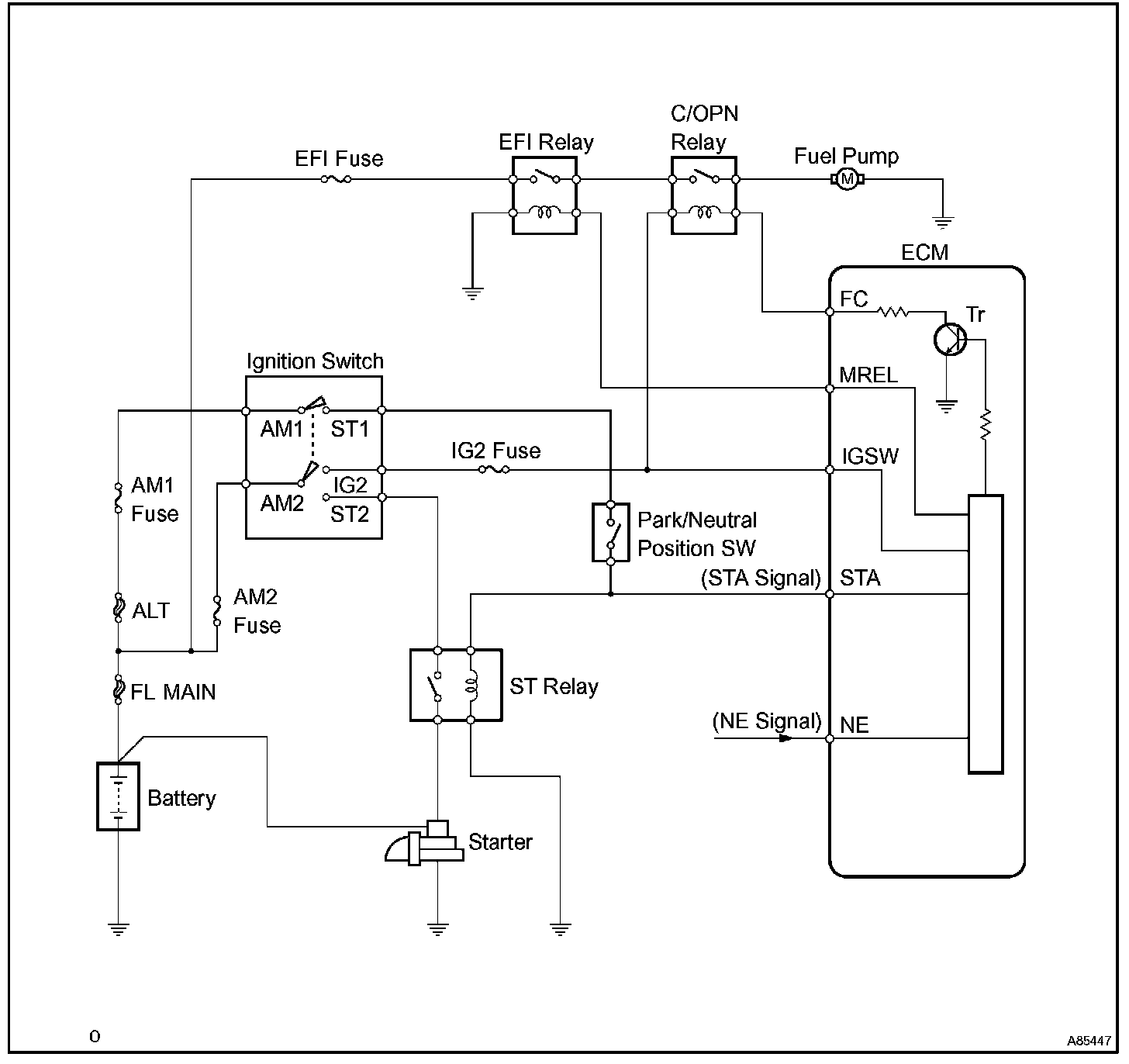 When the STA signal and NE signal are input to the ECM, Tr is turned ON, current flows to coil of the circuit opening relay (Marked: C/OPN), the relay switches on, power is supplied to the fuel pump and the fuel pump operates.