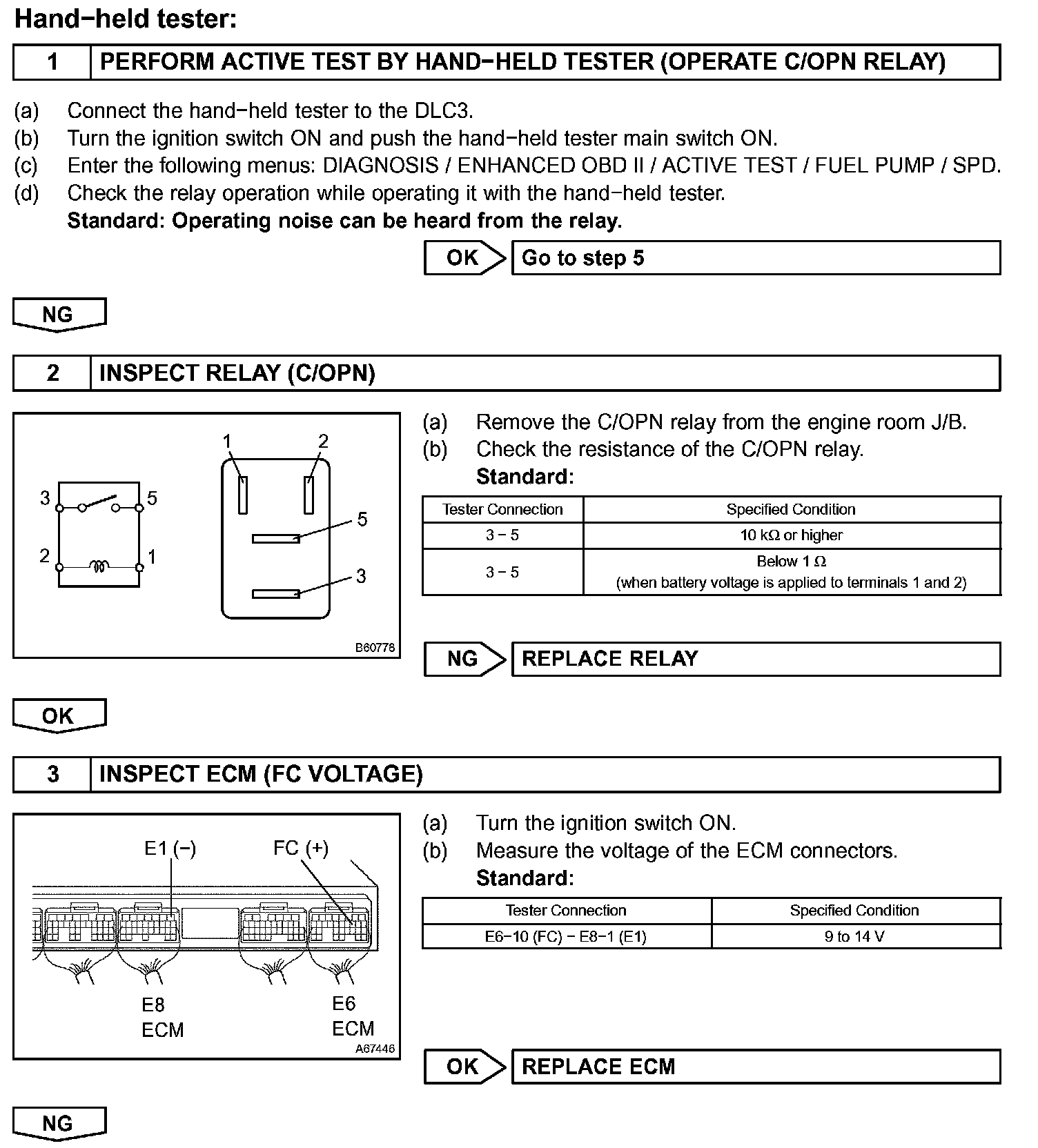 While the NE signal is generated and the engine is running, the ECM keeps Tr ON (C/OPN relay ON) and the fuel pump also keeps operating.