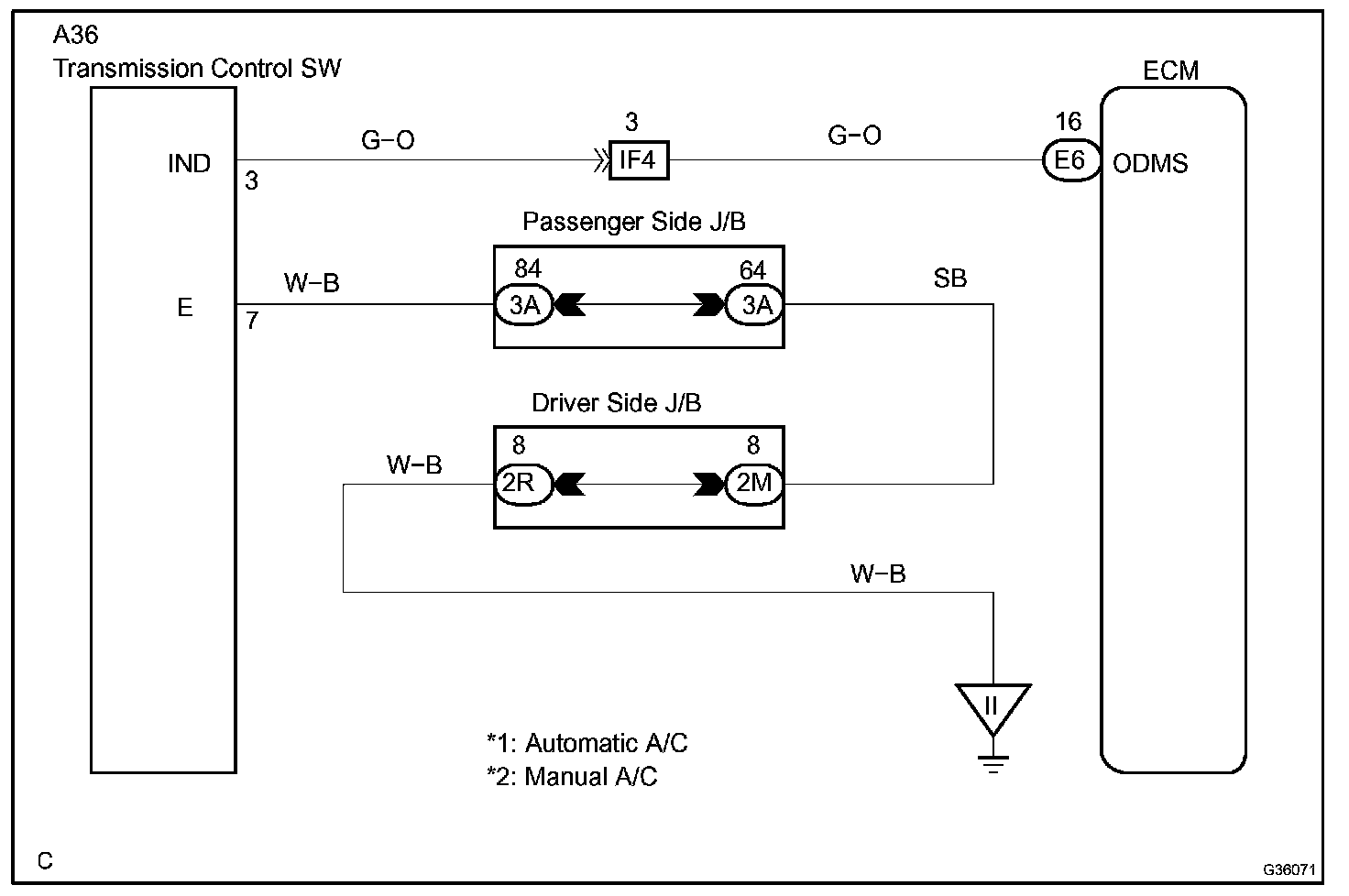 The O/D main switch (transmission control switch) is a momentary type switch. When pressing the O/D main switch, the O/D OFF indicator light lights up and the ECM prohibits shifting into O/D, and when pressing it once again, the O/D OFF indicator light goes off and the ECM allows shifting into O/D. Turning the IG switch OFF will reset the O/D OFF indicator light.