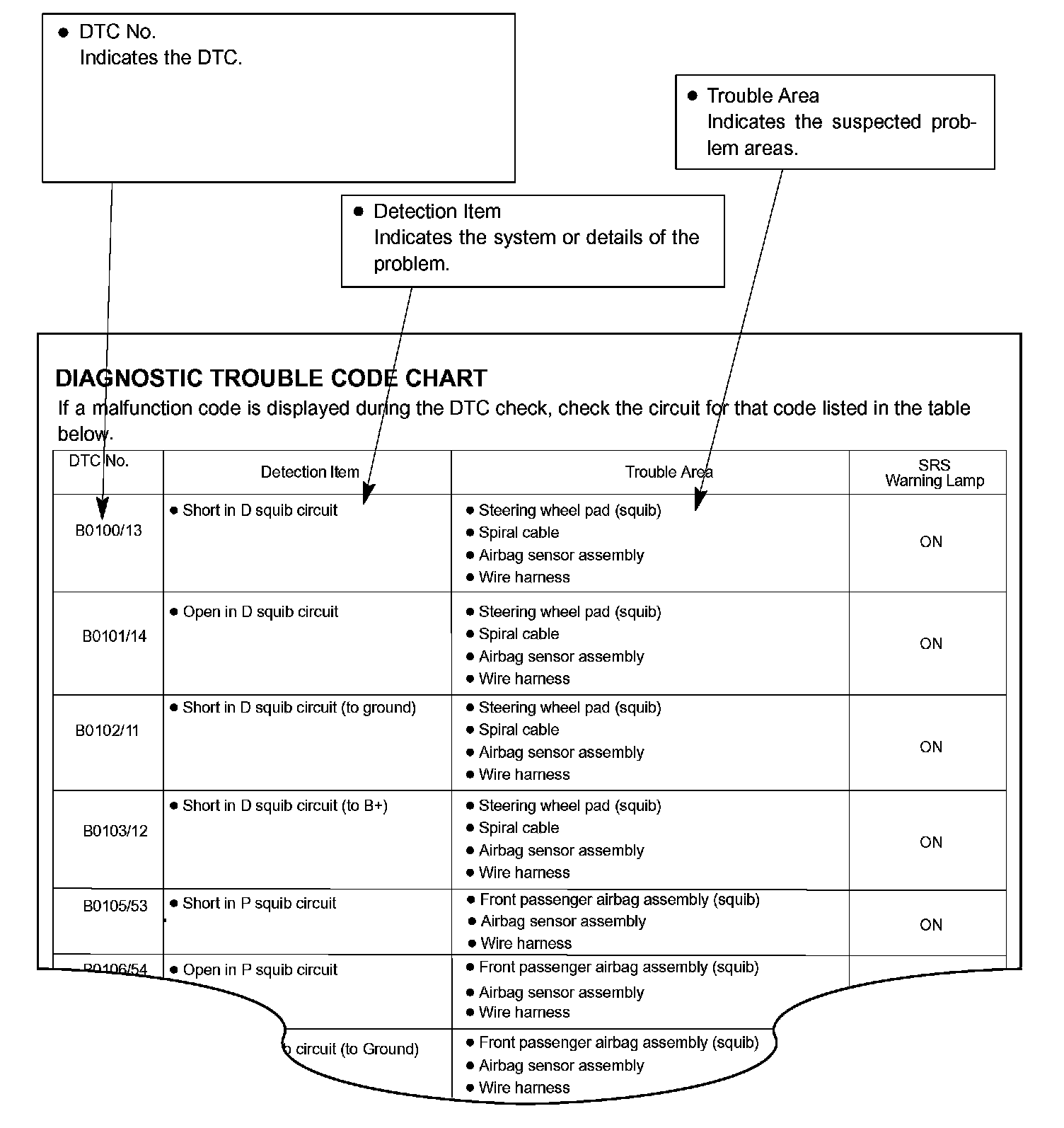 Use Diagnostic Trouble Codes (DTCs) (from the DTC checks) in the table to determine the trouble area and proper inspection procedure. The Supplemental Restraint System (SRS) DTC chart is shown as an example.
