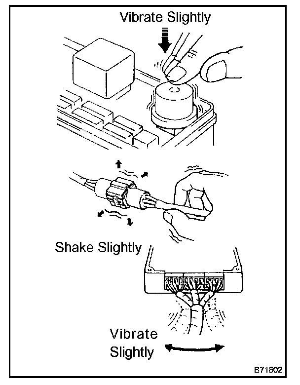 Vibration, heat or water penetration (moisture) is difficult to reproduce. The symptom simulation tests below are effective substitutes for the conditions and can be applied on a stationary vehicle.