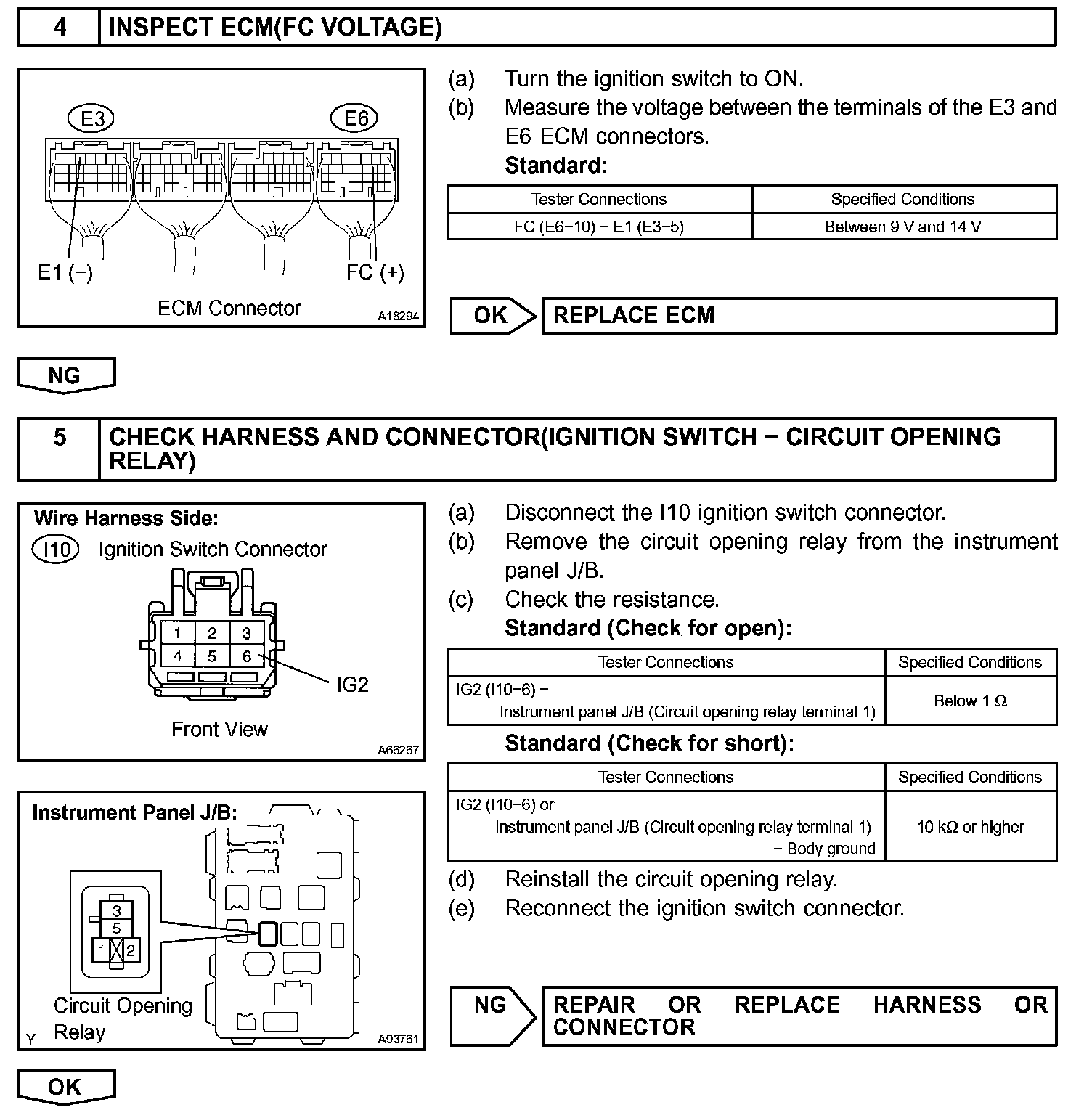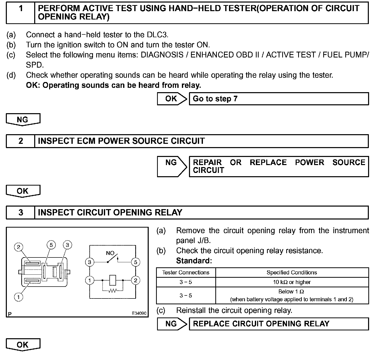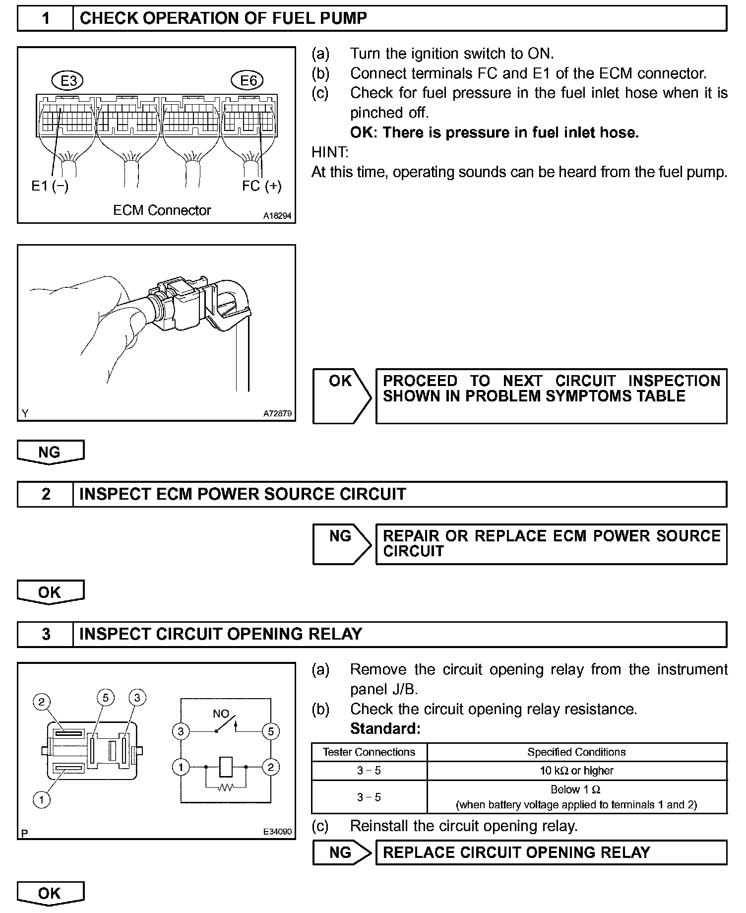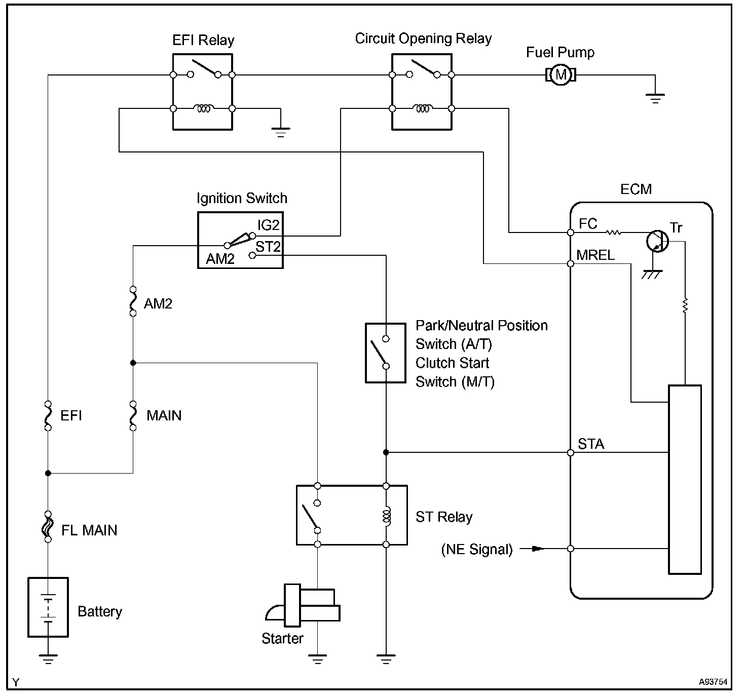 When the STA and NE signals are received by the ECM, Tr (power transistor) is switched on, allowing a current to flow into the circuit opening relay coil. The circuit opening relay switches on, power is supplied to the fuel pump and the fuel pump operates.