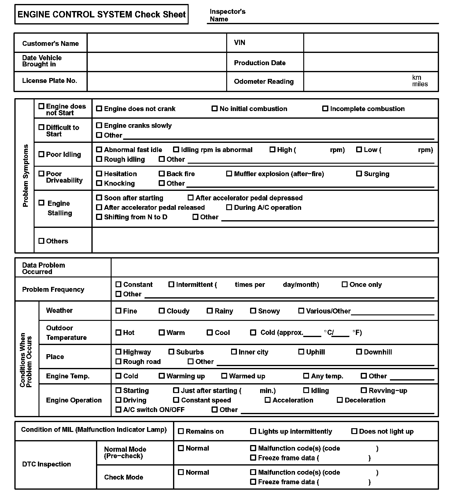 Engine Control System Check Sheet: