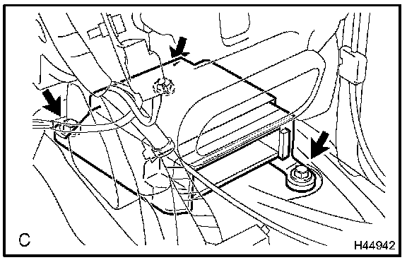 - When installing the airbag sensor assembly center, be careful that the SRS wiring does not interfere with other parts and that it is not pinched between other parts.