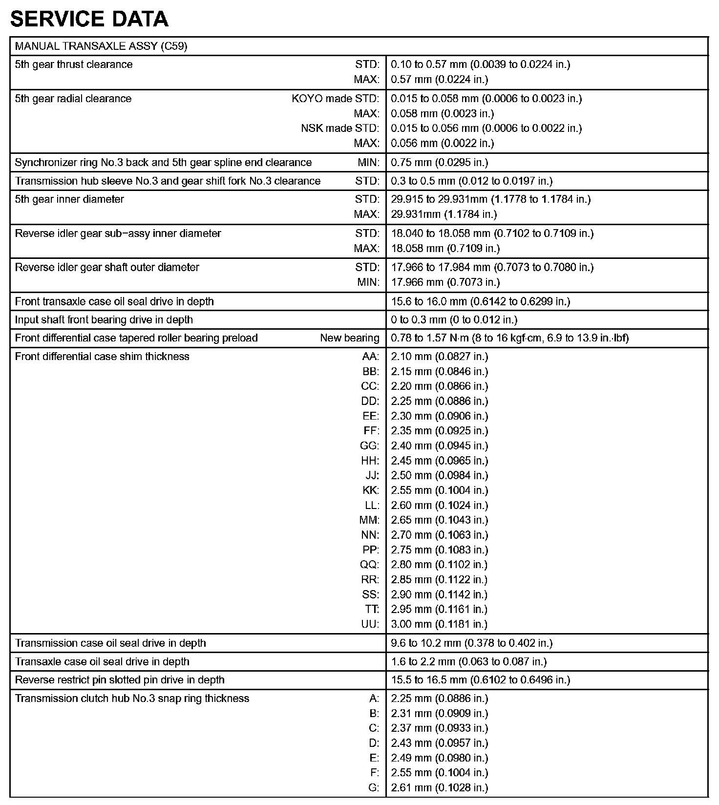 Manual Transmission / Transaxle-Service Data (Part 1):