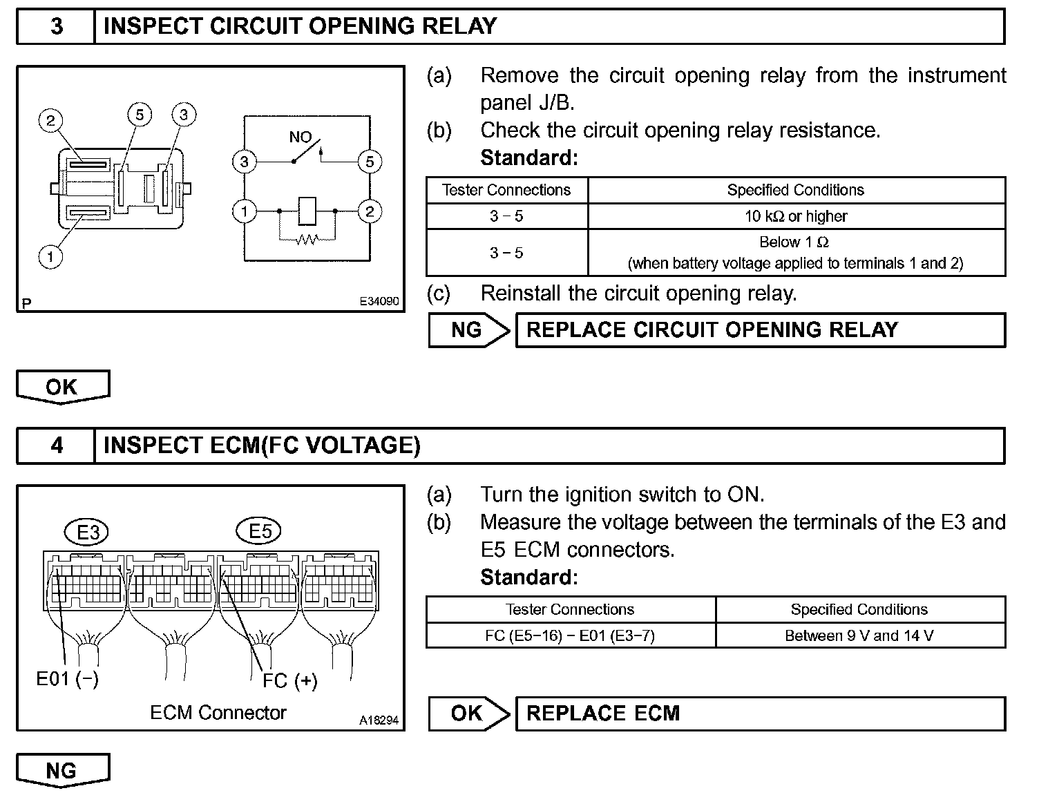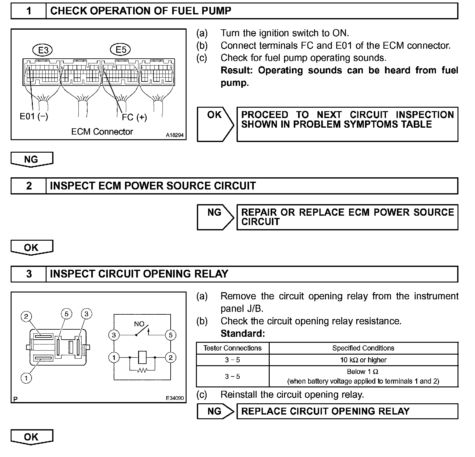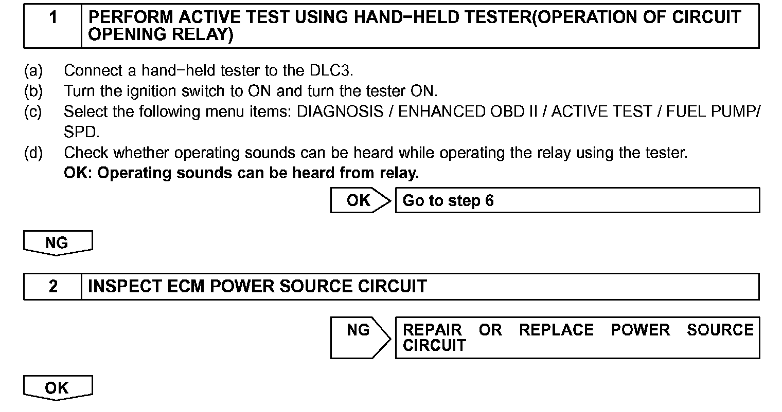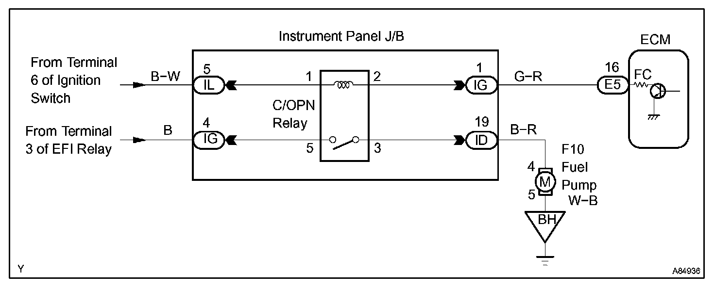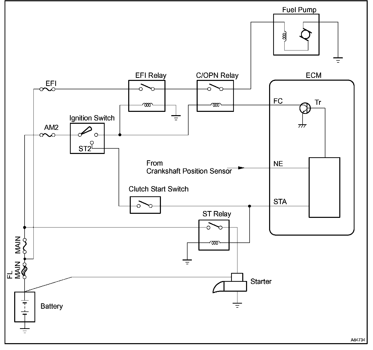 When the STA and NE signals are received by the ECM, Tr (power transistor) is switched on, allowing a current to flow into the circuit opening relay coil. The circuit opening relay switches on, power is supplied to the fuel pump and the fuel pump operates.