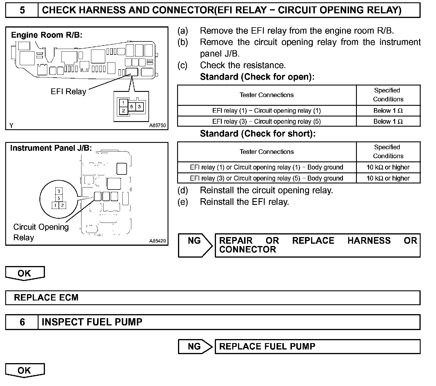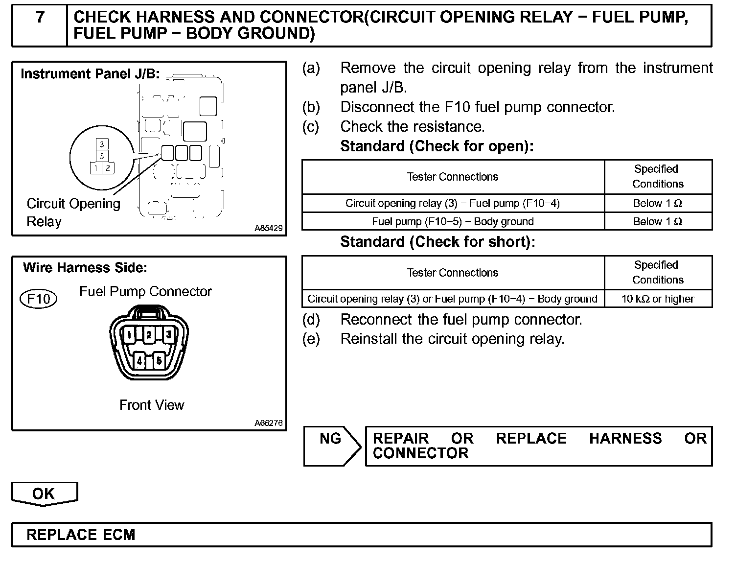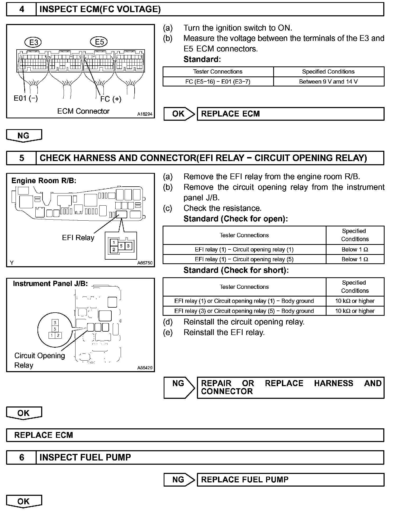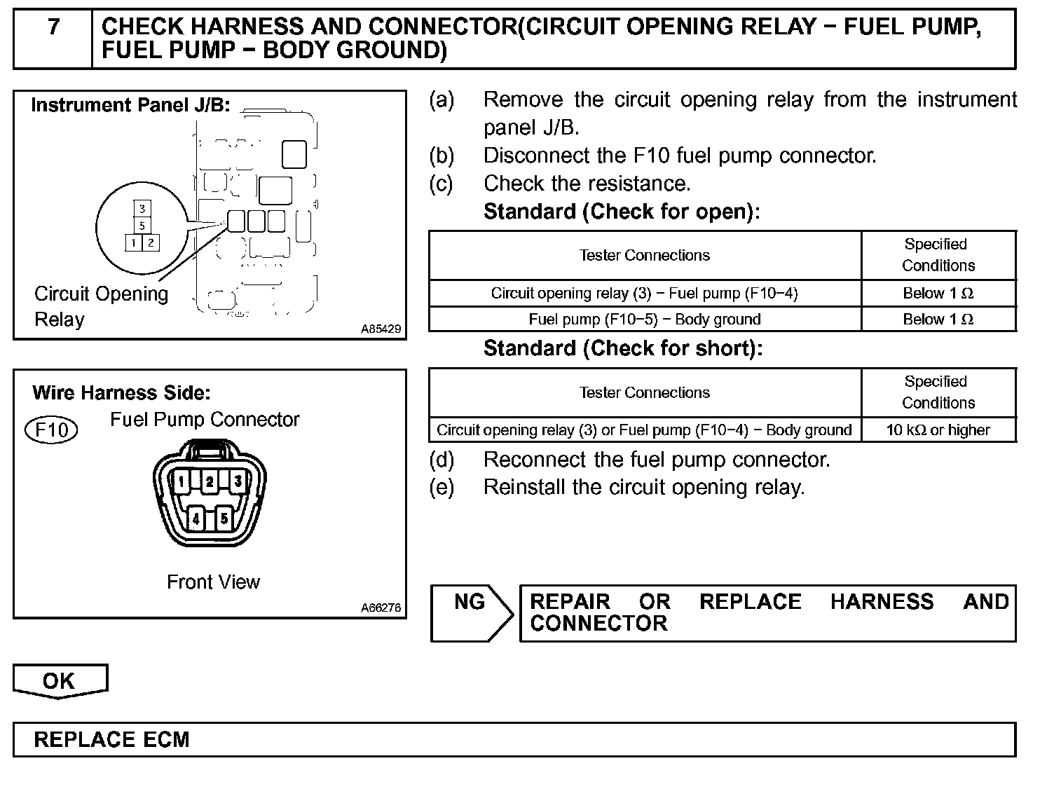 When the STA and NE signals are received by the ECM, Tr (power transistor) is switched on, allowing a current to flow into the circuit opening relay coil. The circuit opening relay switches on, power is supplied to the fuel pump and the fuel pump operates.