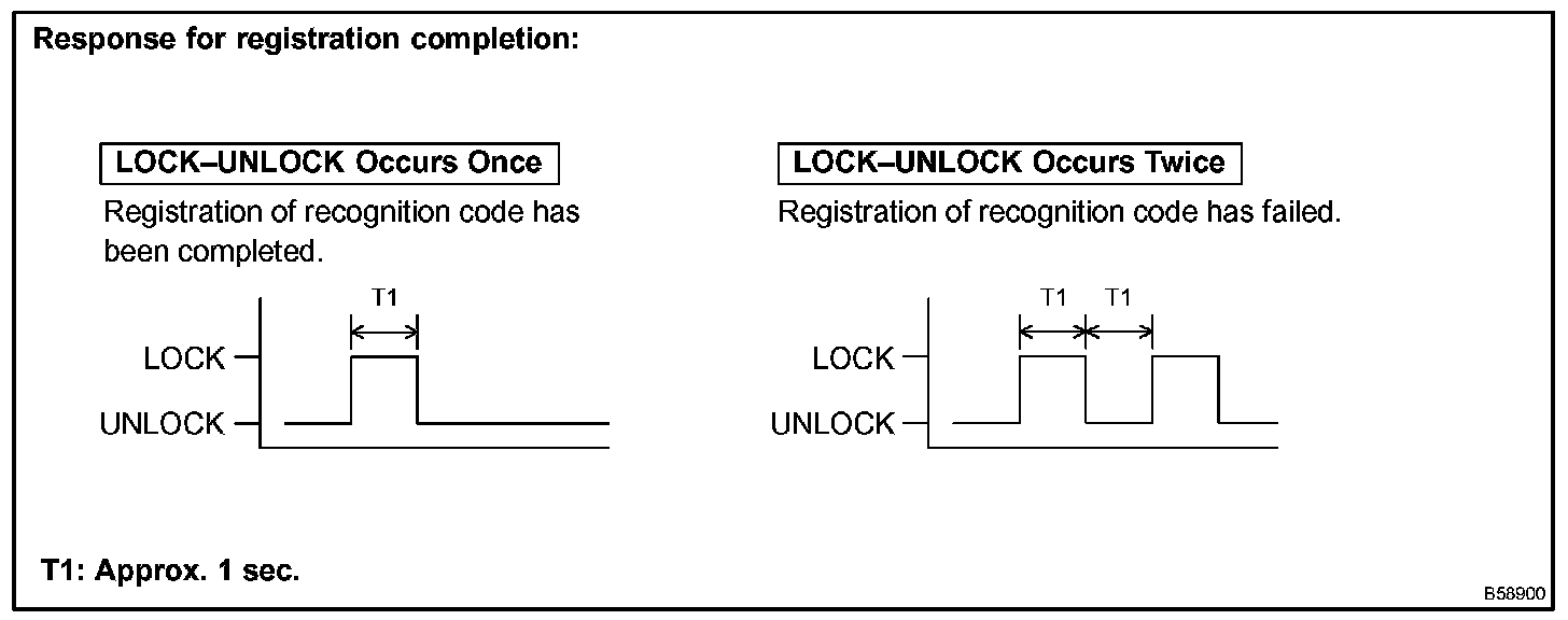 2. Within 3 seconds after the transmitter switch has been released, the LOCK-UNLOCK operation will be automatically performed once if the registration of the recognition code of the transmitter is completed correctly. In case the LOCK-UNLOCK operation is performed twice, the registration of recognition code has failed. Perform the registration procedure from the beginning once again.
