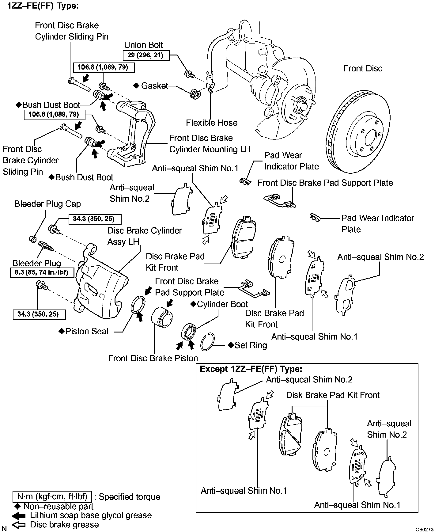 c) 1ZZ-FE(FF) type: Install the pad wear indicator plate facing upward, and install each pad.