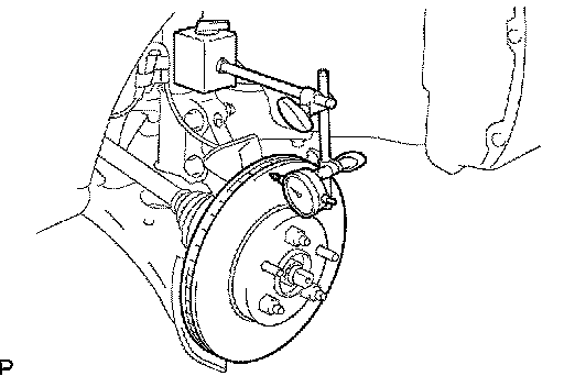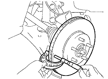 c) If the disc runout is the maximum value or greater, check the bearing play in the axial direction and check the axle hub runout. If the bearing play and axle hub runout are normal, adjust the disc runout or grind it on a "On-car" brake lathe.