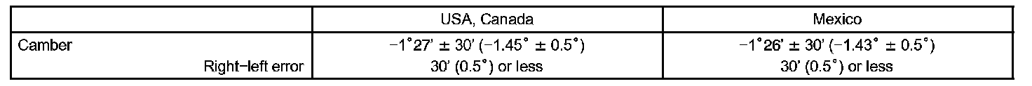 If the measured value is not within the specified value, inspect the suspension parts for damage and/or wear and replace them if necessary because camber is not adjustable.