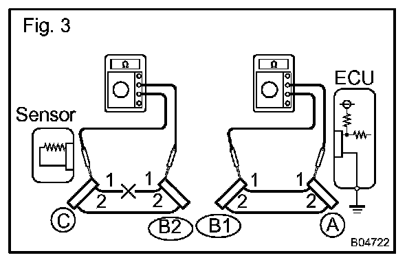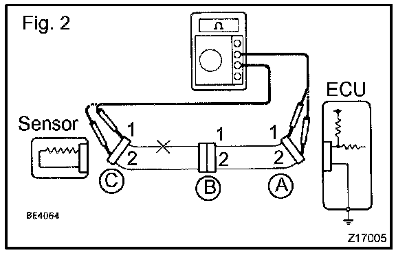 CHECK OPEN CIRCUITa. For an open circuit in the wire harness in Fig. 1, perform a resistance check (step b) or a voltage check (step c).