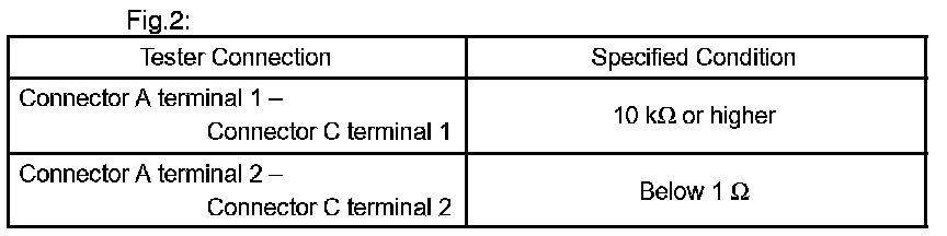 If your results match the examples above, an open circuit exists in the wire harness between terminal 1 of connector B and terminal 1 of connector C.