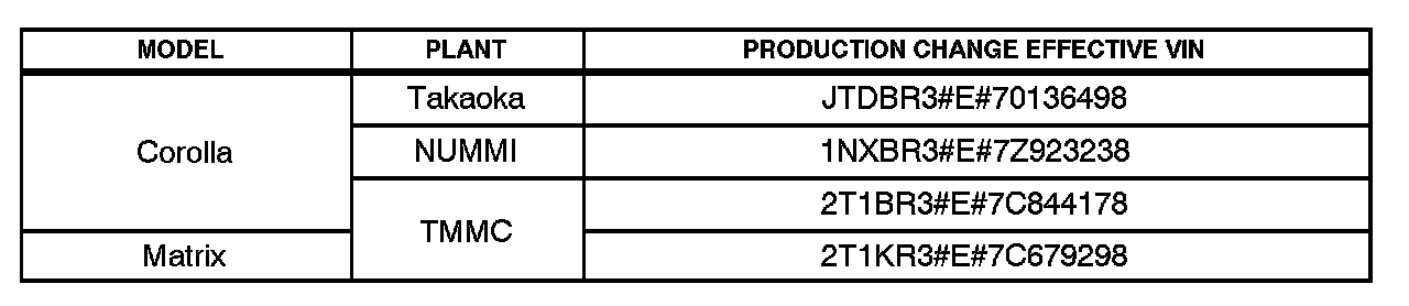 ^ 2005 - 2007 model year Corolla and Matrix (2WD) vehicles equipped with the 1ZZ-FE engine and produced BEFORE the Production Change Effective VINs shown below.