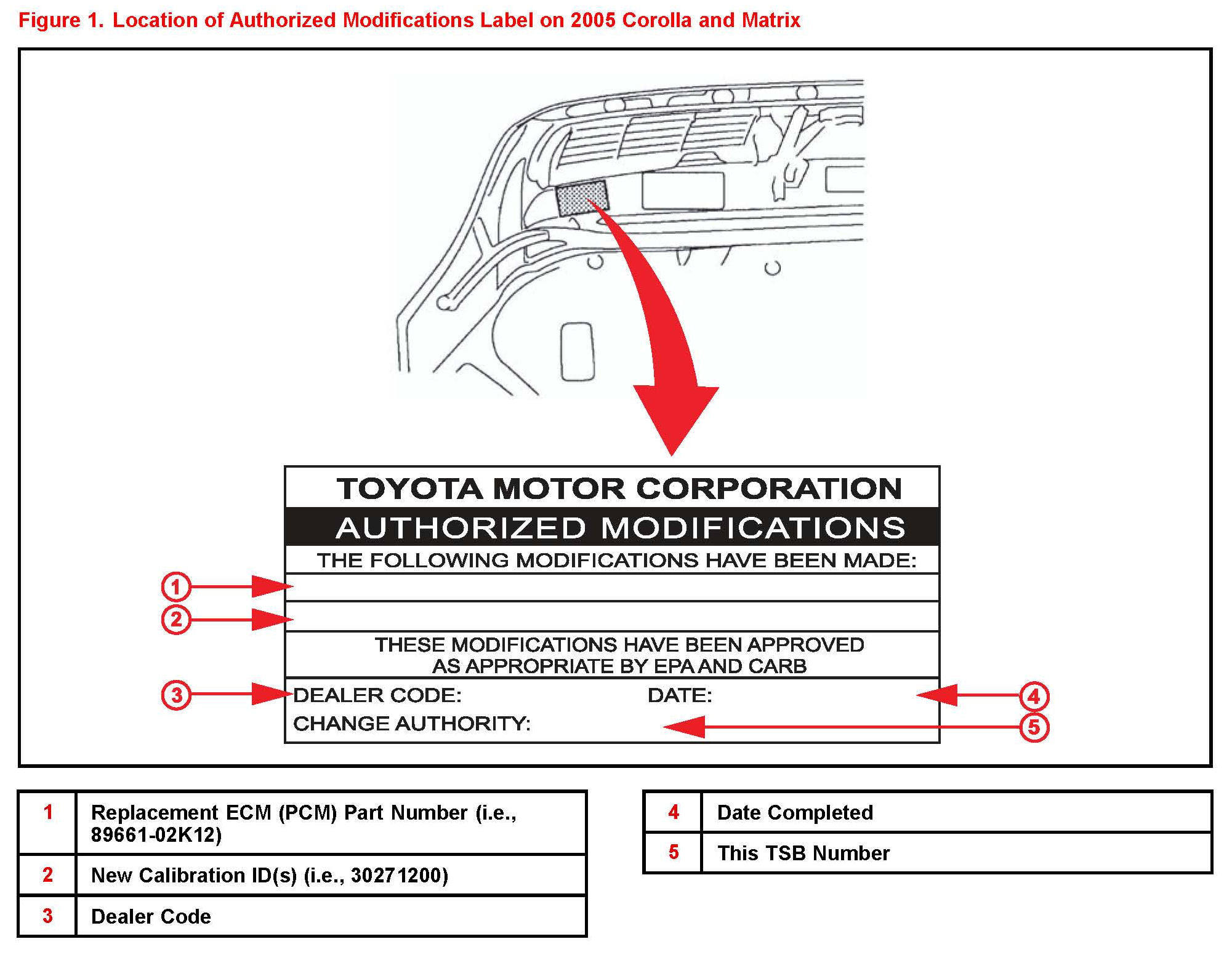 4. Check for the Authorized Modifications Label affixed to the vehicle in the location shown in Figure 1. Confirm if the ECM (PCM) calibration has been updated. If the calibration ID listed is NOT the latest ECM (PCM) calibration - go to step 5.