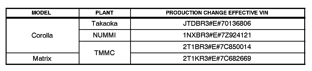 ^ 2005 - 2007 model year Corolla and Matrix (2WD) vehicles equipped with the 1ZZ-FE engine and produced BEFORE the Production Change Effective VINs shown below.