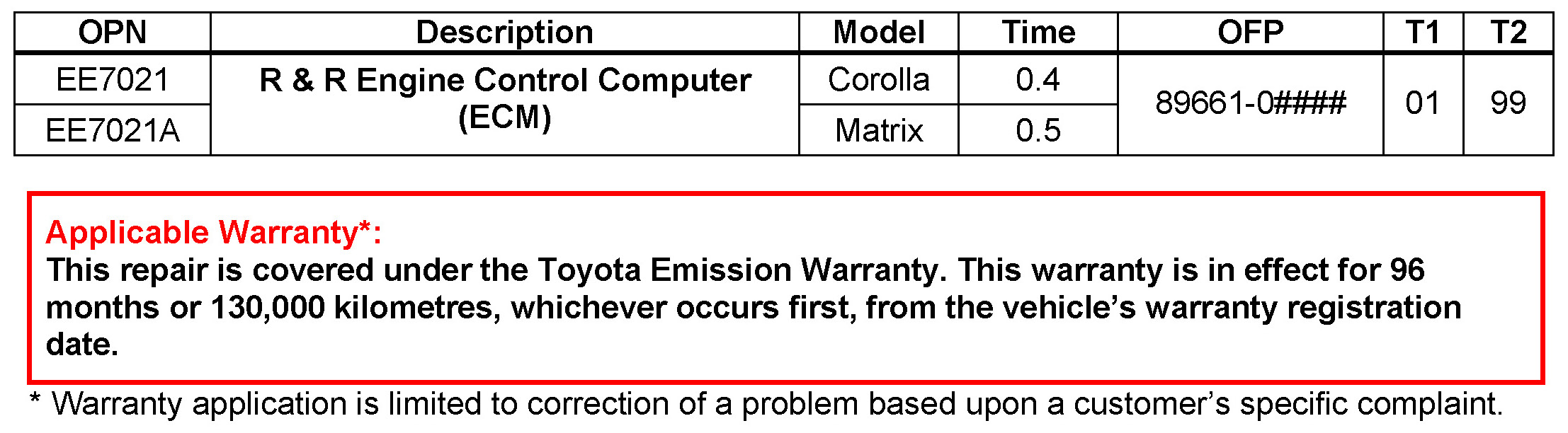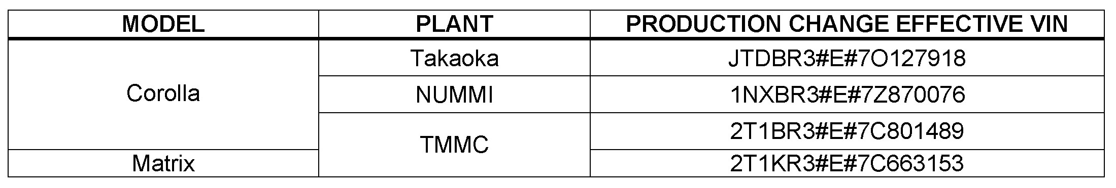 - 2006 - 2007 model year Corolla and Matrix (2WD) vehicles equipped with the 1ZZ-FE engine and produced BEFORE the Production Change Effective VINs shown below.