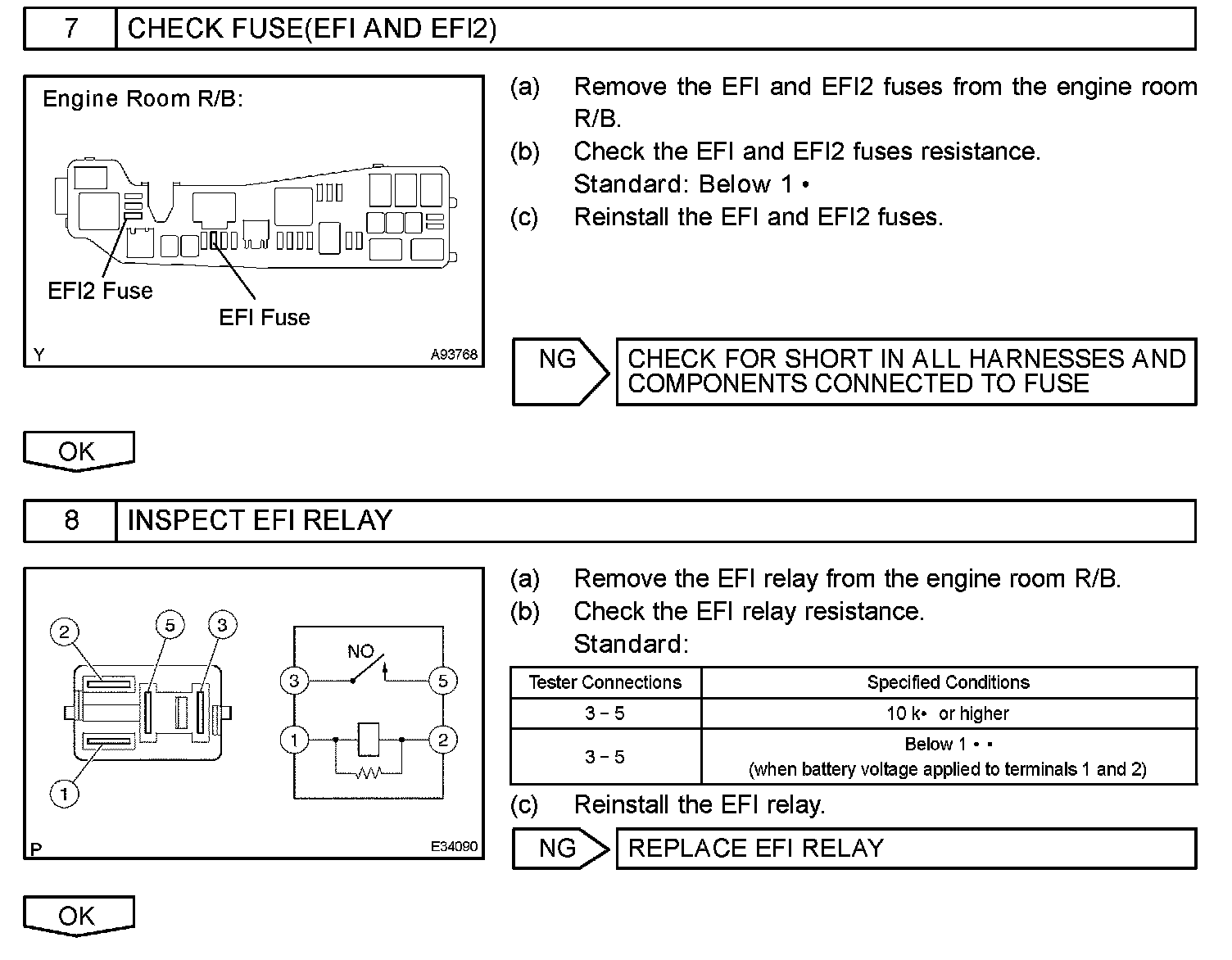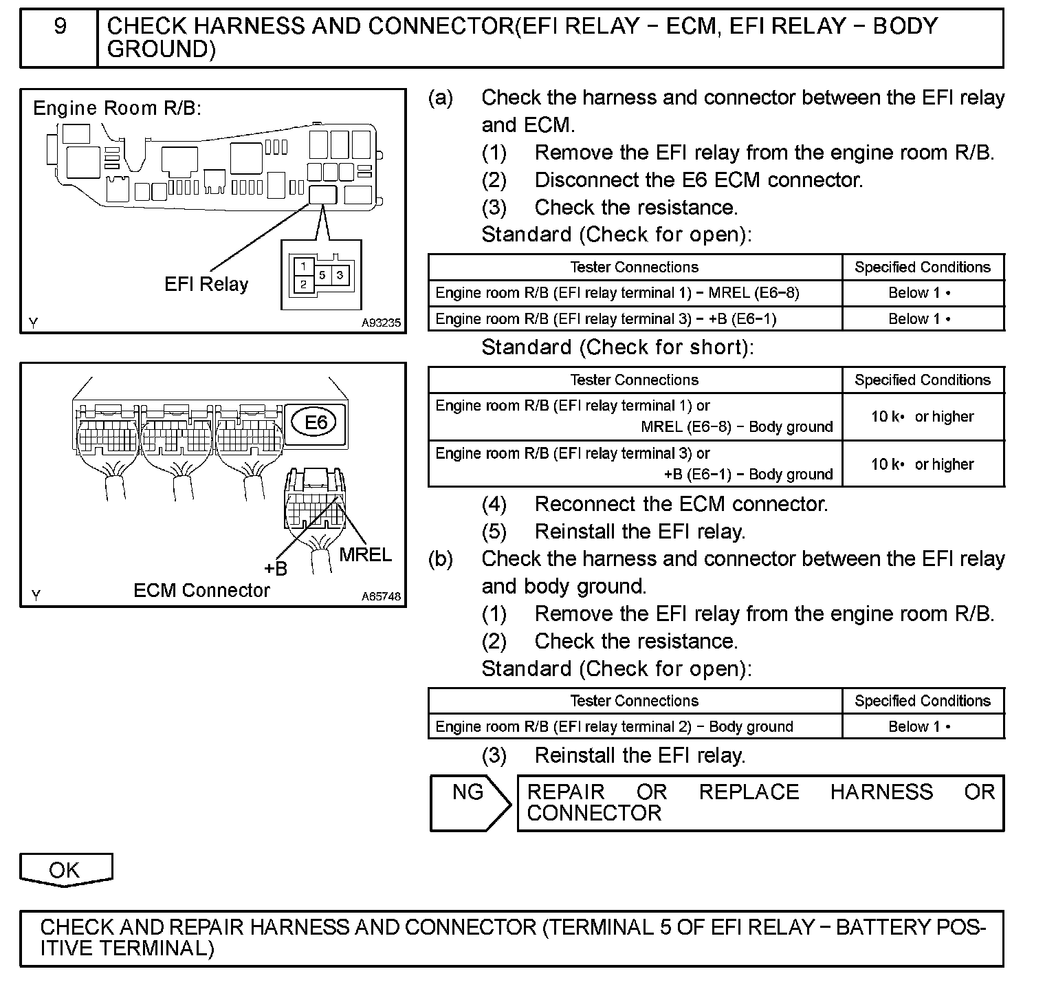 When the ignition switch is turned to ON, battery voltage is applied to terminal IGSW of the ECM. The ECM MREL output signal causes current to flow to the coil, closing the contacts of the EFI relay and supplying power to terminal +B of the ECM.