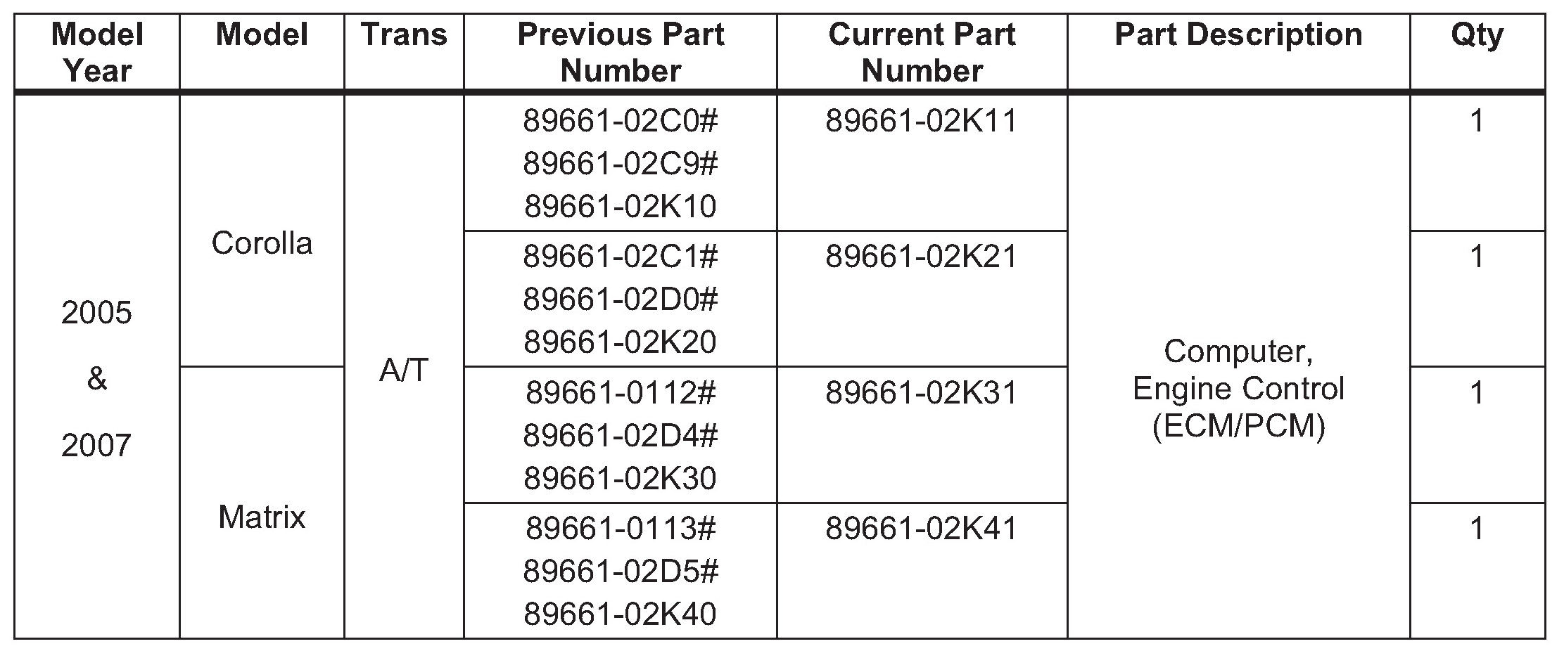 - August 30, 2007: 2007 model year Corolla and Matrix vehicles have been added to Applicable Vehicles.