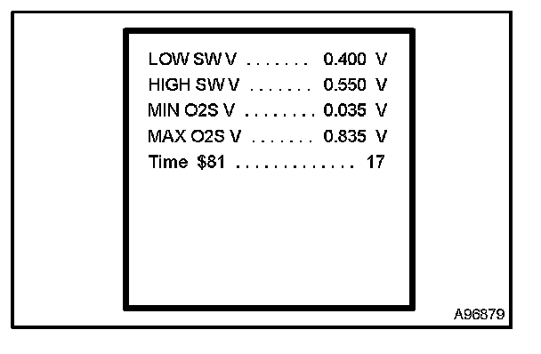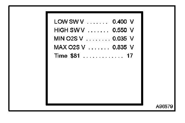 NOTE: Until the HO2 sensor monitor runs to completion, when it fails to complete or when the ignition switch is turned to OFF, the tester screen displays the upper and lower viewable limit values for the monitor (for example, voltages: 0 V and 1.275 V, seconds: 0 and 10.2, and Test Value: 0 and 255).