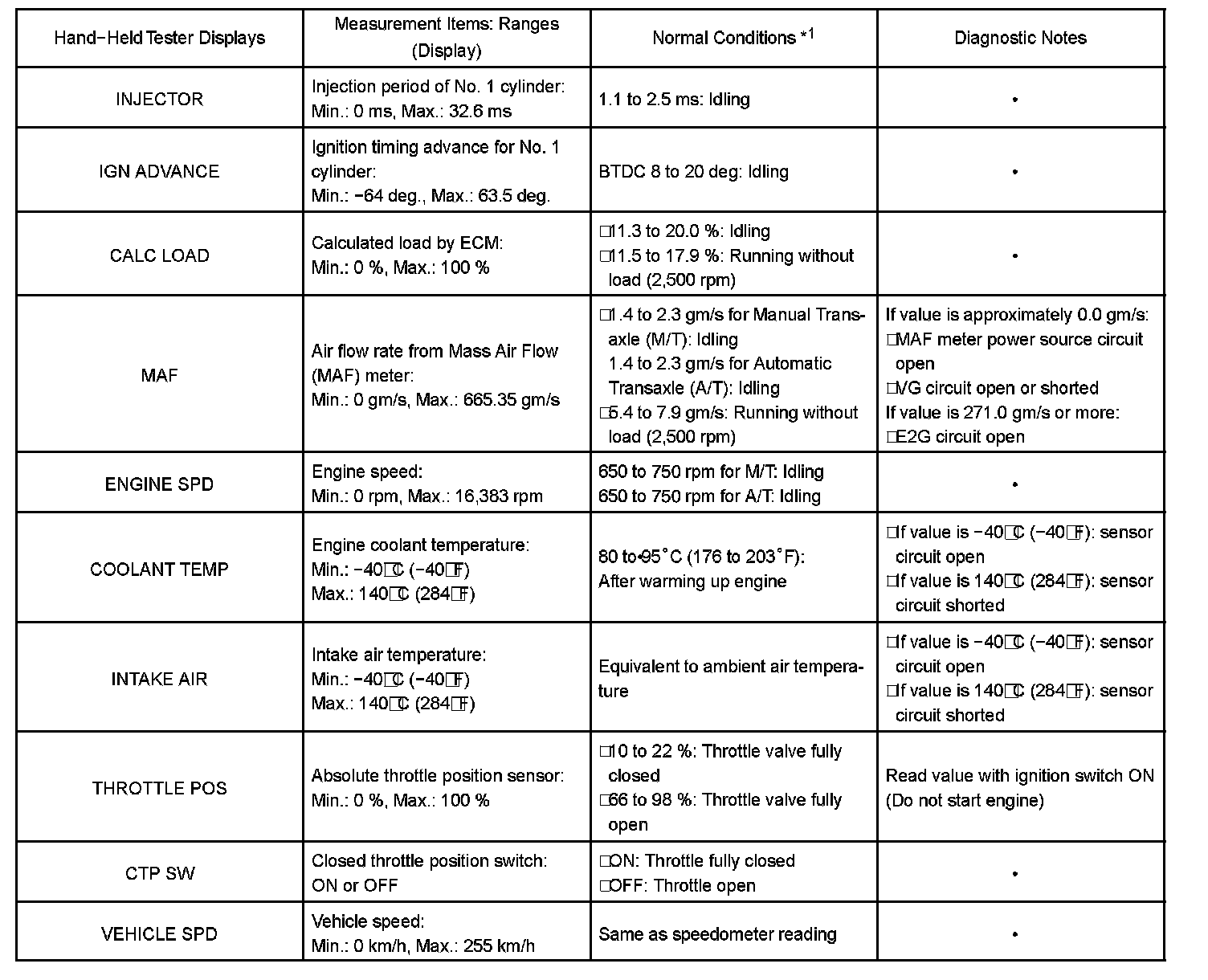 DATA LISTHINT: By reading the DATA LIST displayed on a hand-held tester or OBD II scan tool, you can check values, including those of the switches, sensors, and actuators, without removing any parts. Reading the DATA LIST as the first step of troubleshooting is one method of shortening diagnostic time.