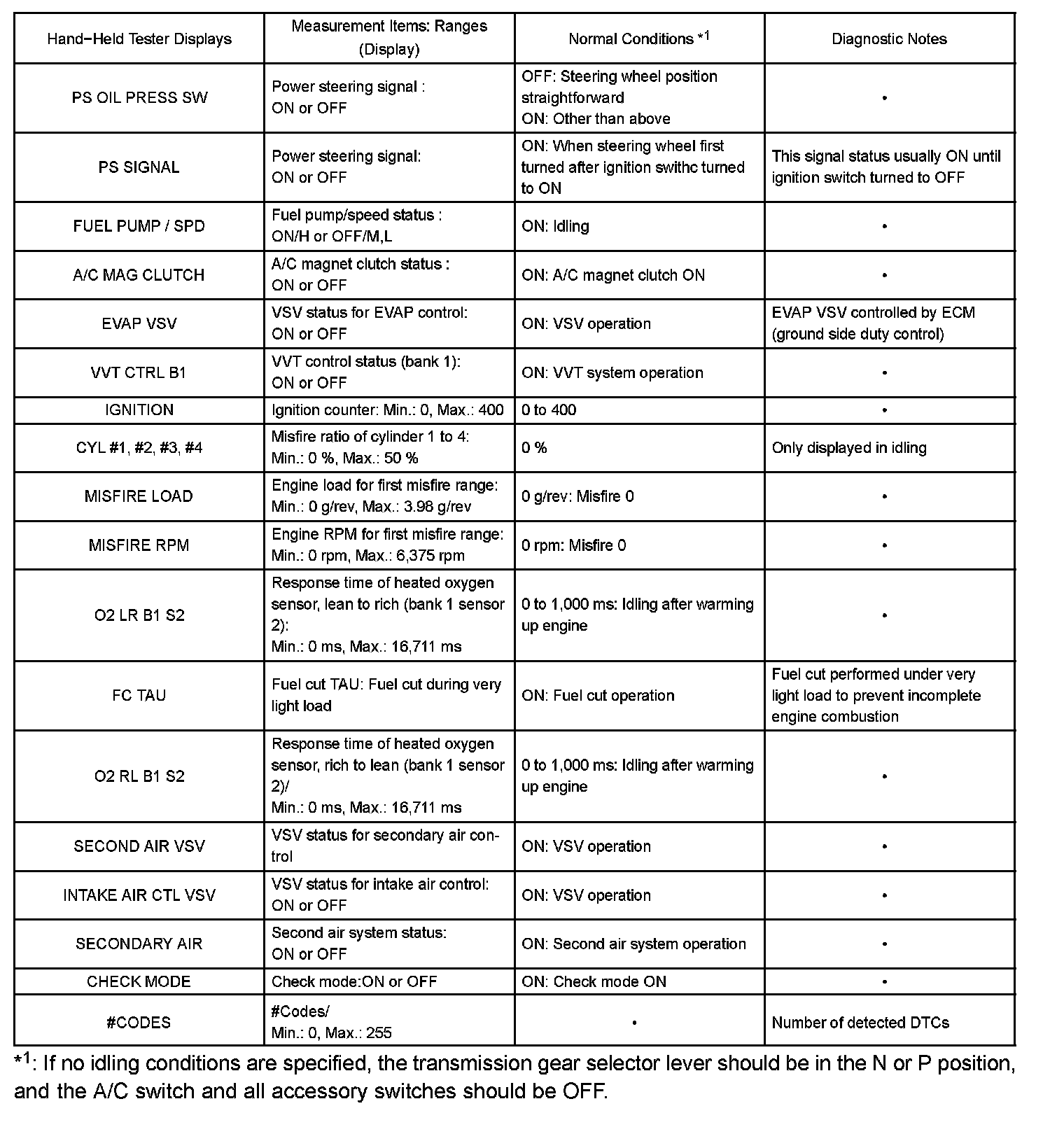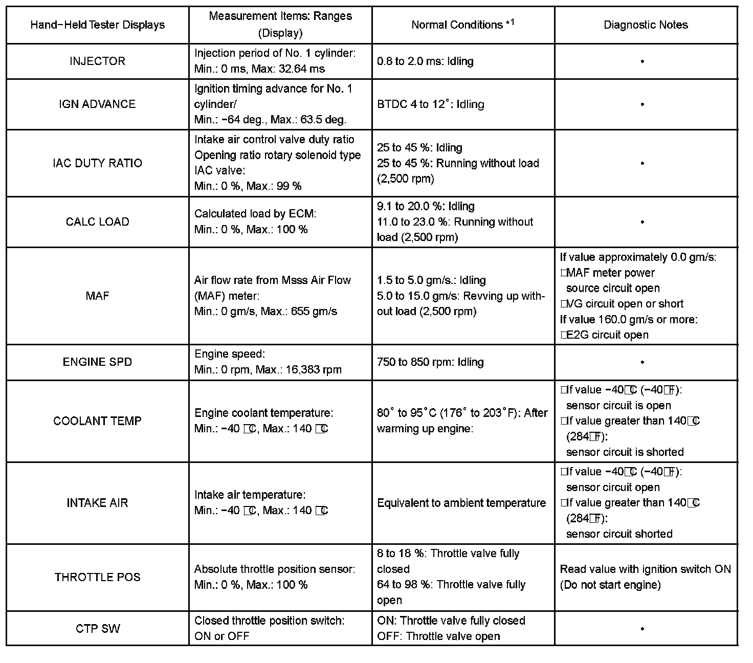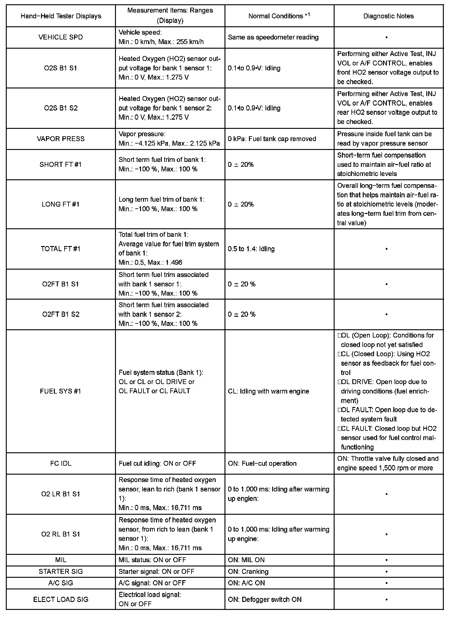 DATA LISTHINT: By reading the DATA LIST displayed on a hand-held tester or OBD II scan tool, you can check values, including those of the switches, sensors, and actuators, without removing any parts. Reading the DATA LIST as the first step of troubleshooting is one method of shortening diagnostic time.