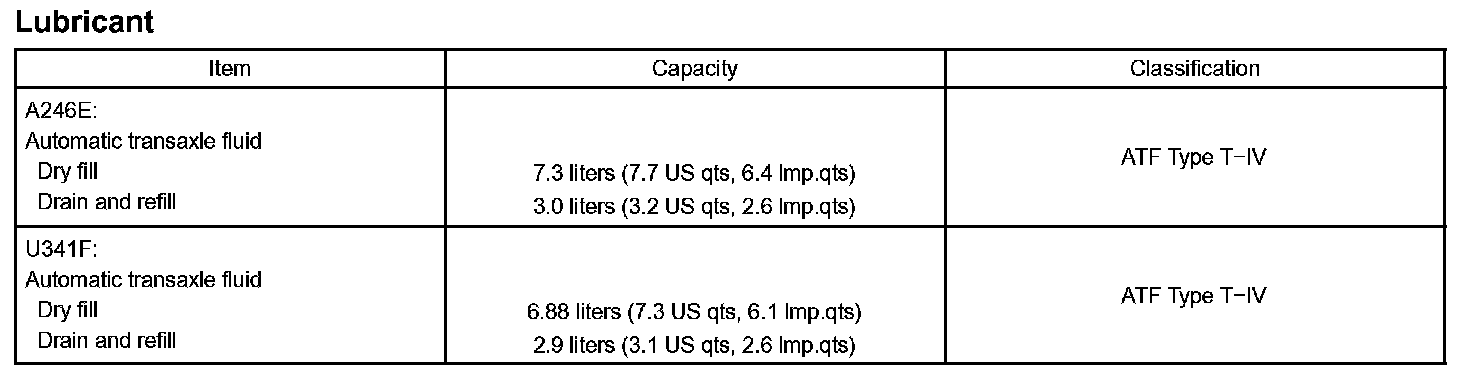 Notice: Using automatic transmission fluid other than "Toyota Genuine ATF Type T-IV" may cause deterioration in shift quality, locking up of your transmission accompanied by vibration, and ultimately damage the automatic transmission of your vehicle.