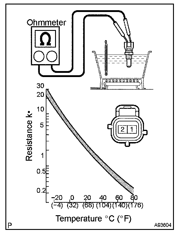 NOTE: If checking the engine coolant temperature sensor in water, be careful not to allow water to intrude into the terminals. After checking, wipe up water on the engine coolant temperature sensor.