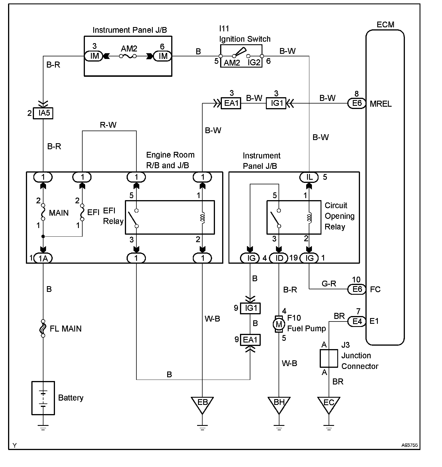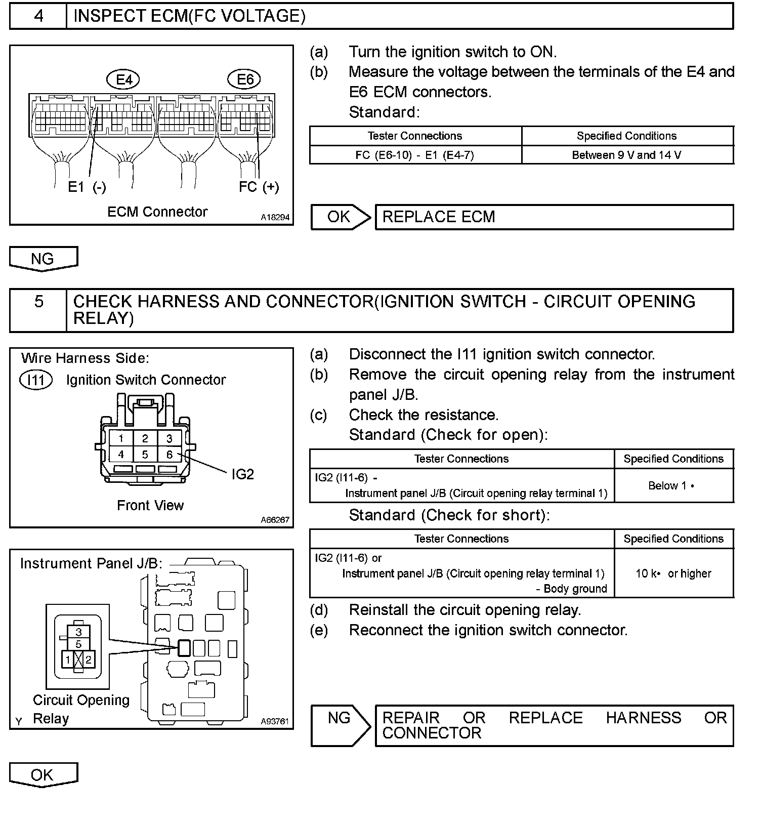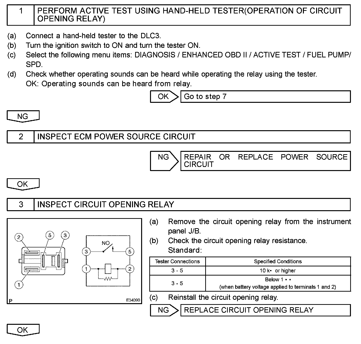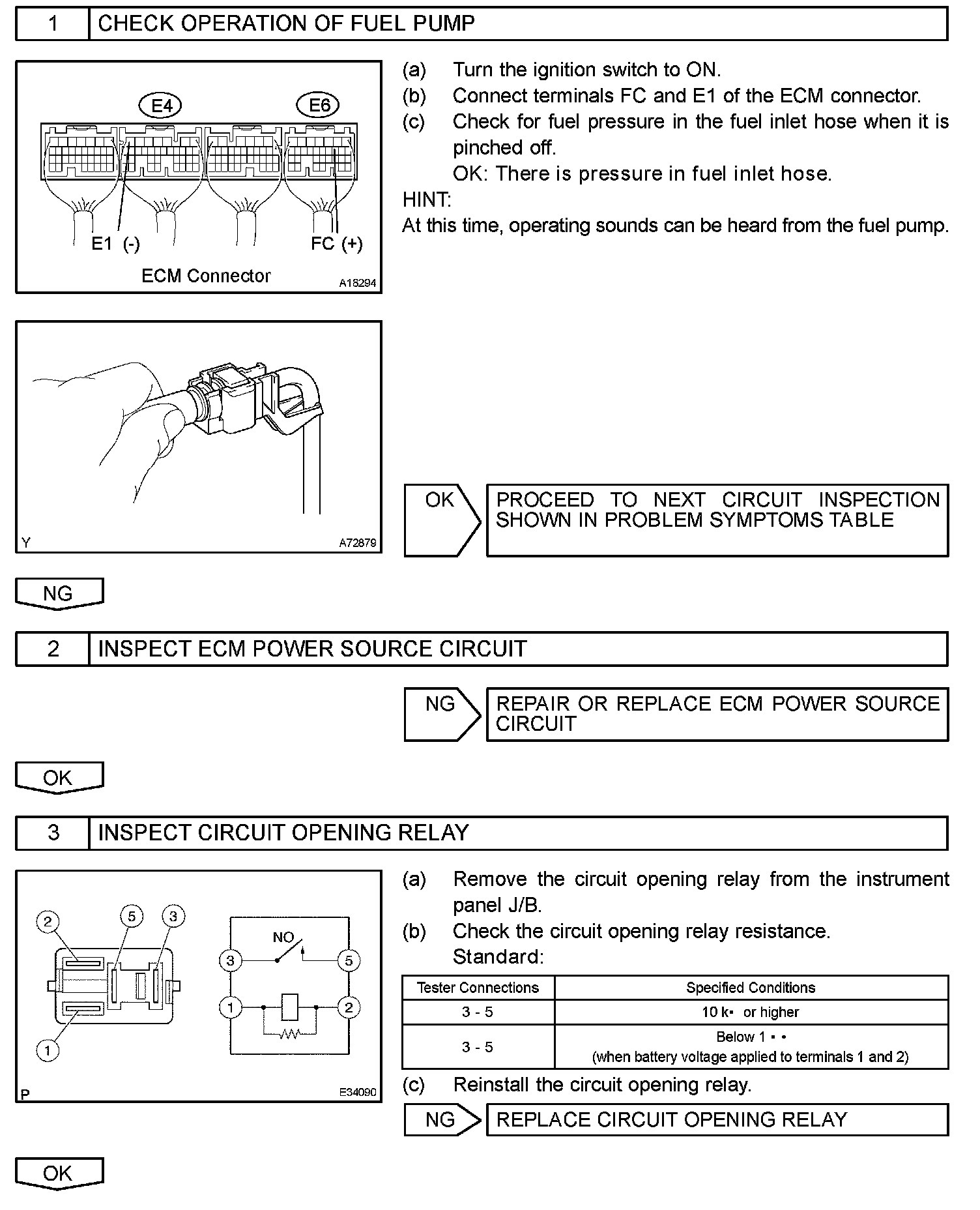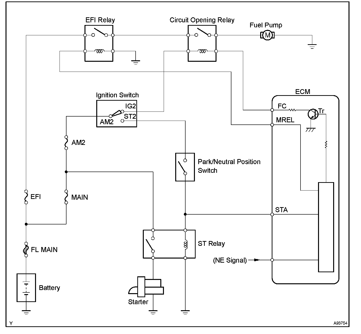 When the STA and NE signals are received by the ECM, Tr (power transistor) is switched on, allowing a current to flow into the circuit opening relay coil. The circuit opening relay switches on, power is supplied to the fuel pump and the fuel pump operates.