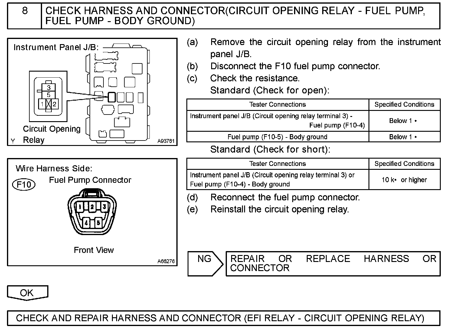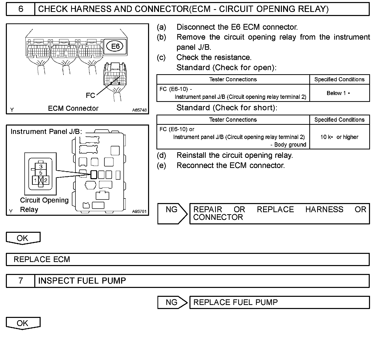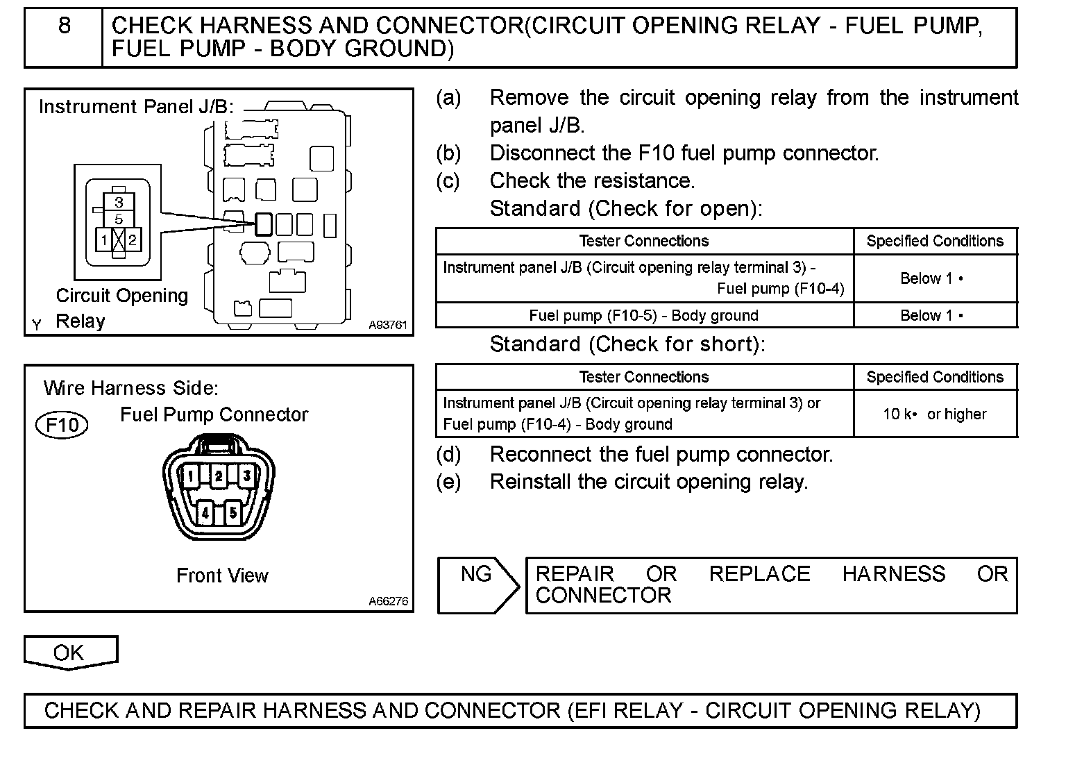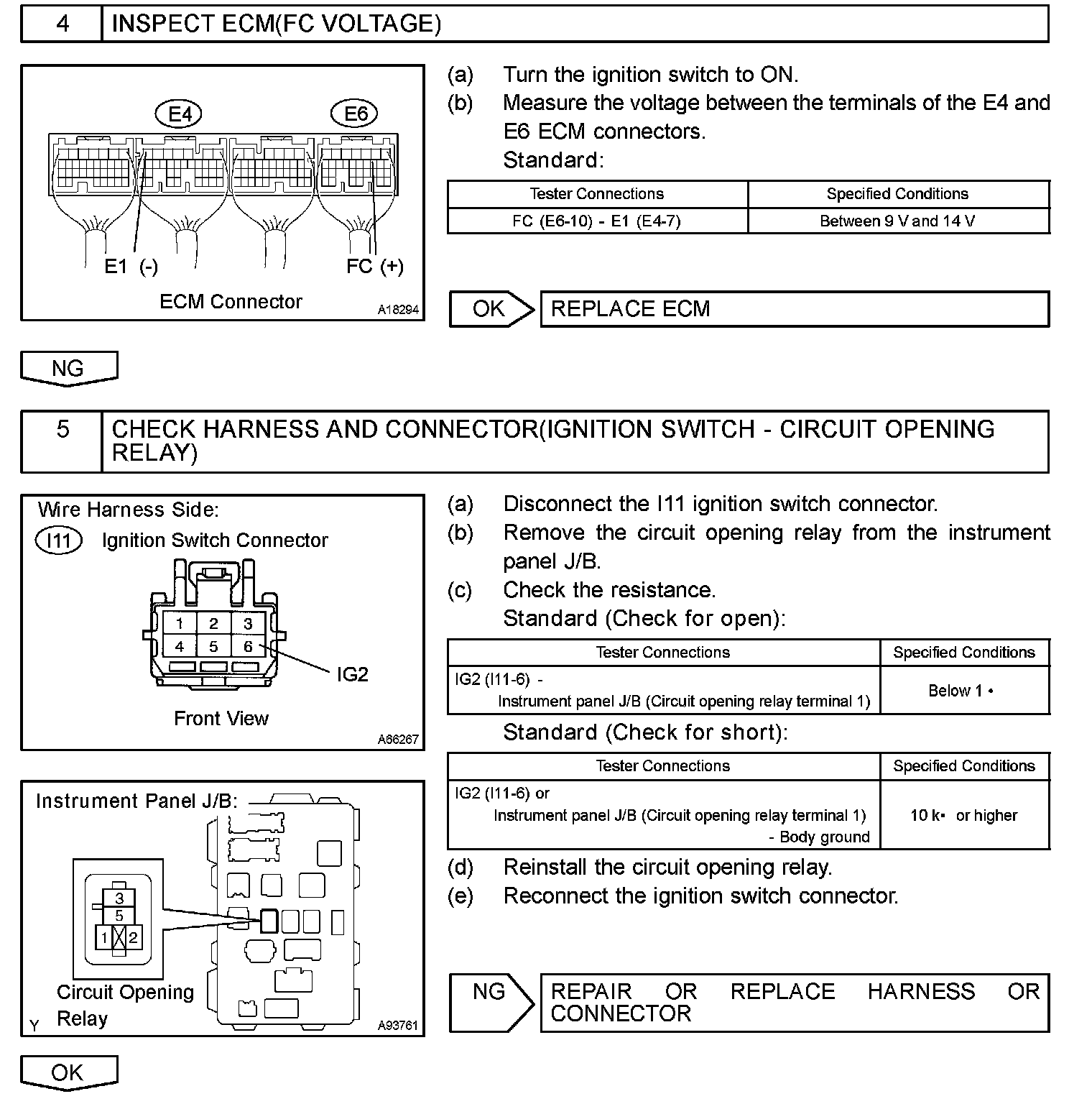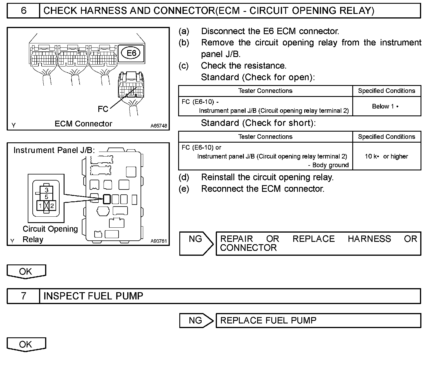 When the STA and NE signals are received by the ECM, Tr (power transistor) is switched on, allowing a current to flow into the circuit opening relay coil. The circuit opening relay switches on, power is supplied to the fuel pump and the fuel pump operates.