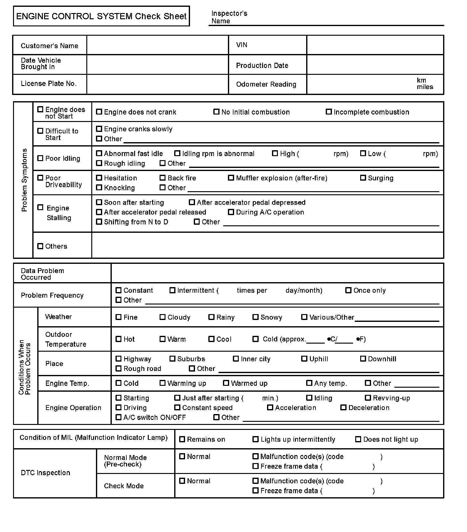 Engine Control System Check Sheet:
