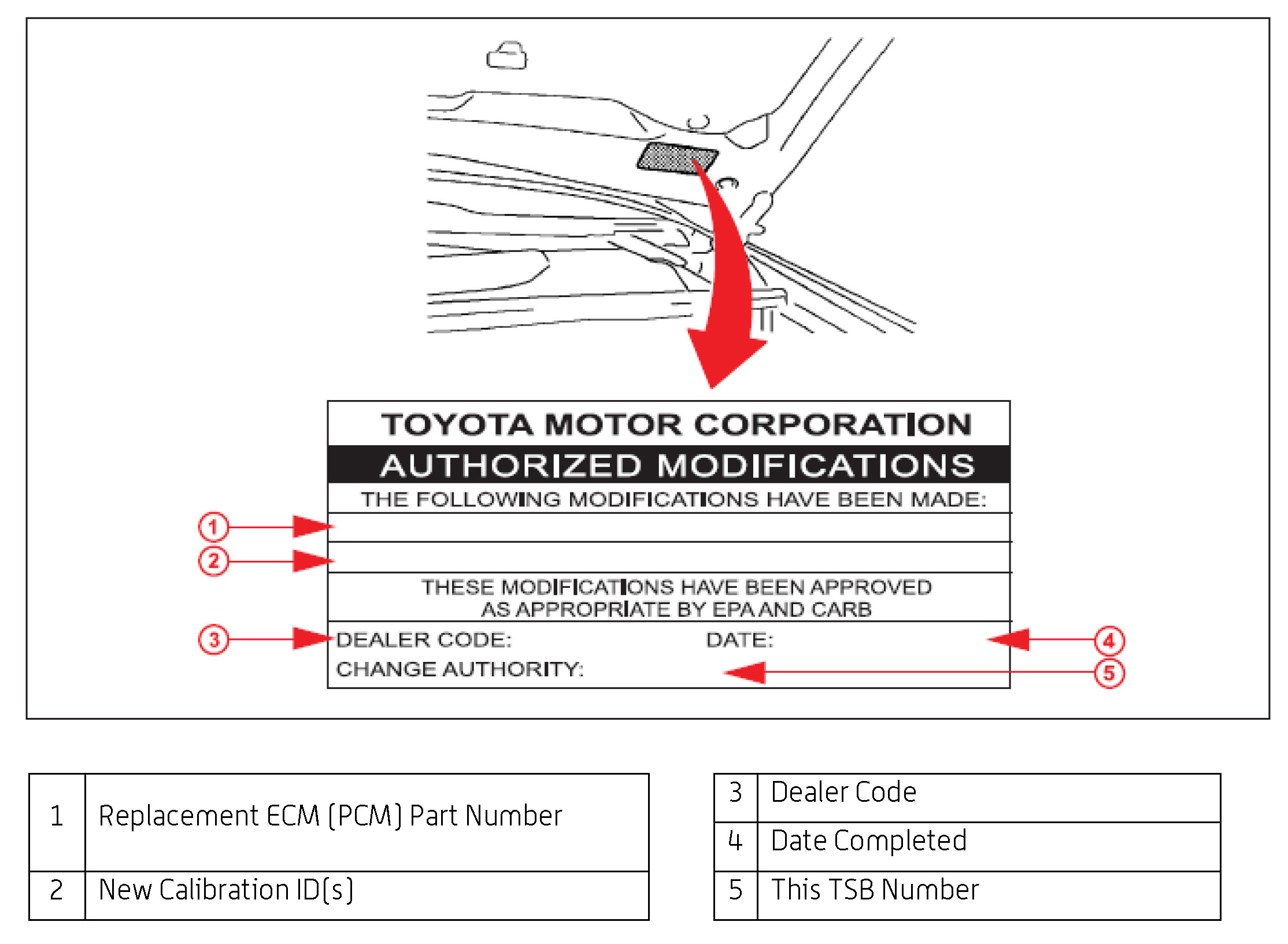 1. Check for the Authorized Modifications Label affixed to the vehicle in the location shown in Figure 1. Confirm if the ECM [PCM] calibration has been updated. If the calibration ID listed is NOT the latest ECM [PCM] calibration - go to step 2.