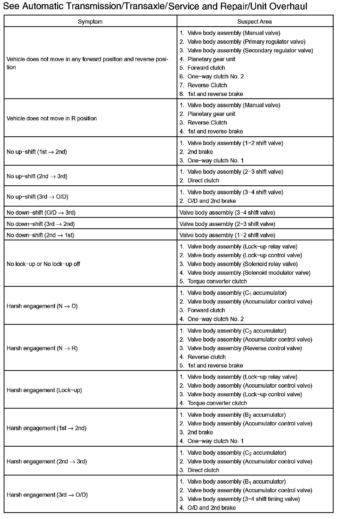 PROBLEM SYMPTOMS TABLEHINT: If a normal code is displayed during the diagnostic trouble code check although the trouble still occurs, check the electrical circuits for each symptom in the order given in the charts and proceed to the given troubleshooting.