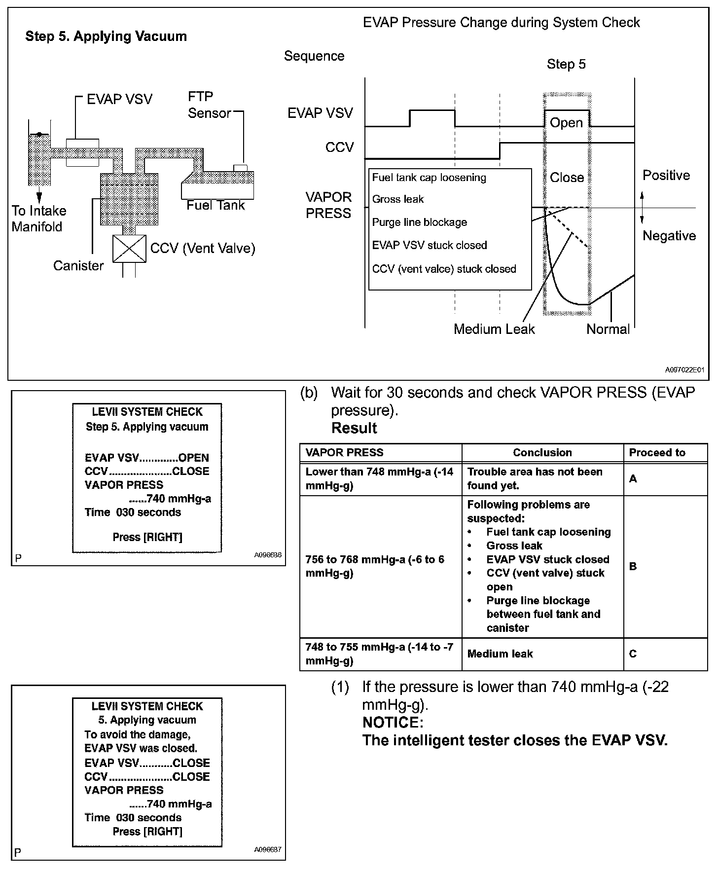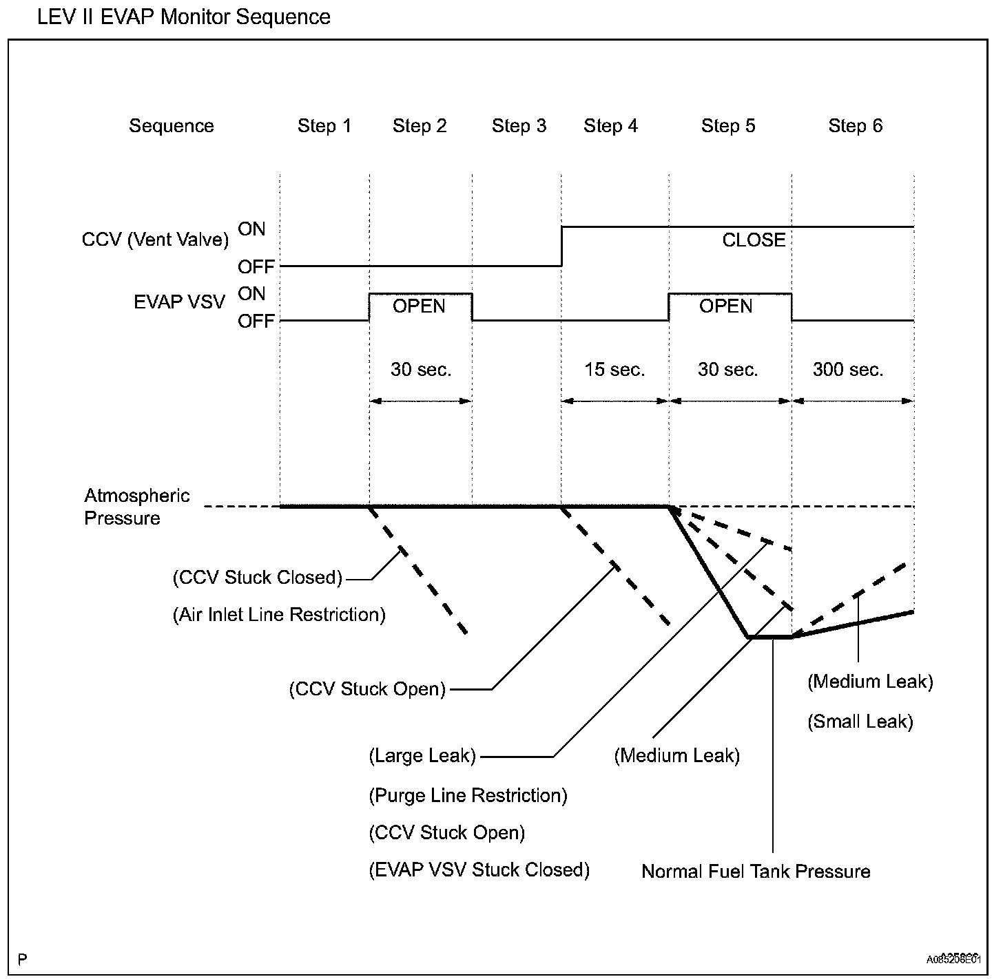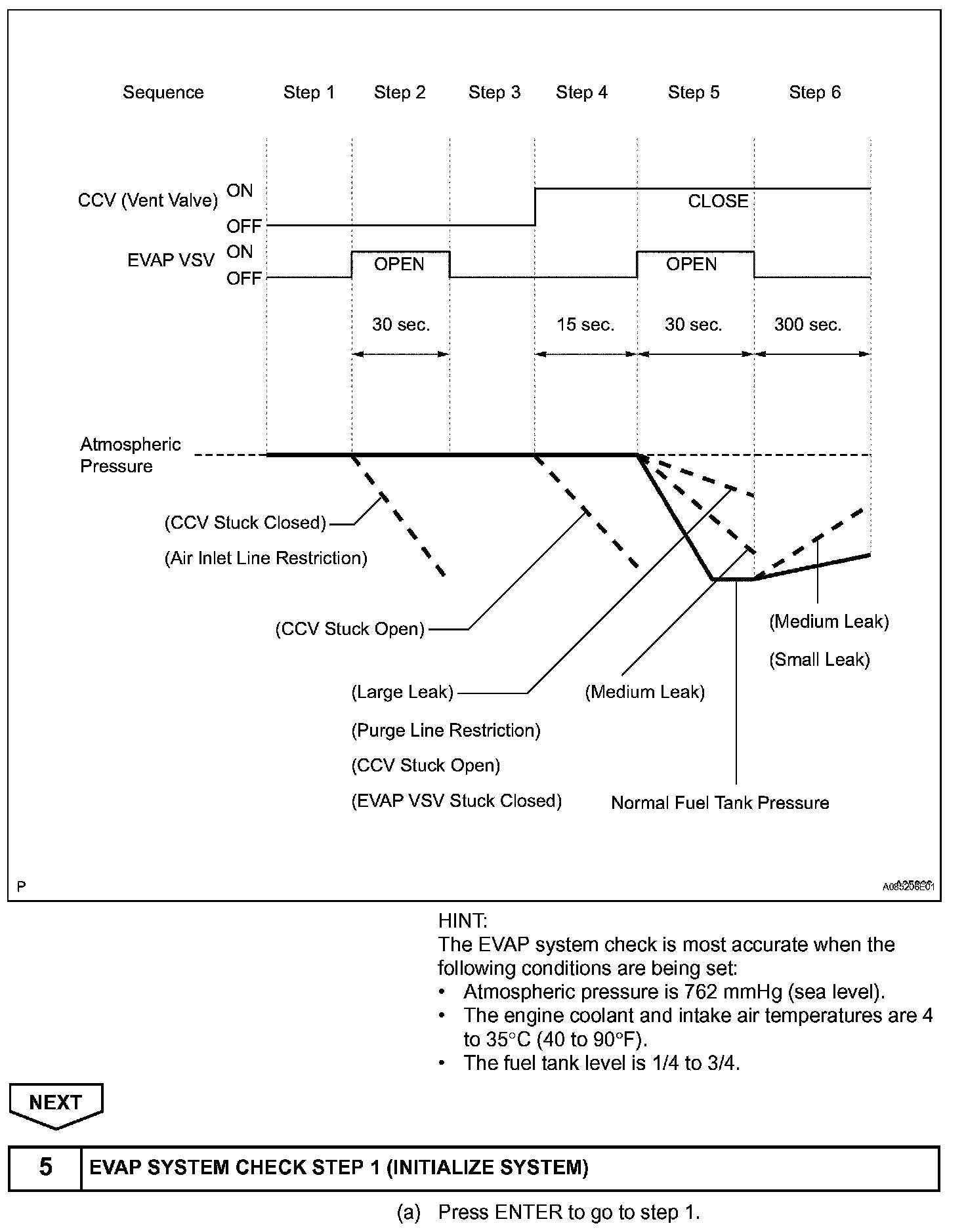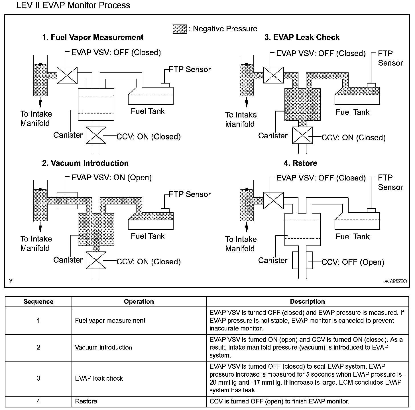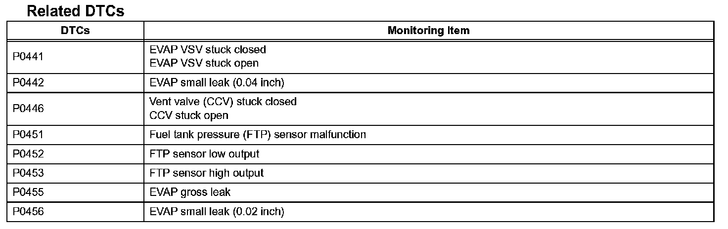 The EVAP monitor's purpose is to check for EVAP leaks and EVAP VSV and CCV malfunctions. The monitor performs the check by first introducing the intake manifold's negative pressure (vacuum) to the EVAP system. Then, the monitor records change in the EVAP system's pressure levels. The monitor runs when the following conditions are met: