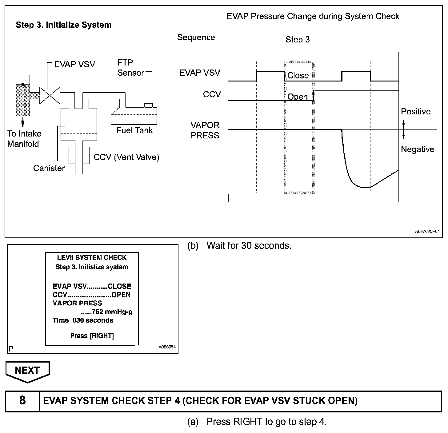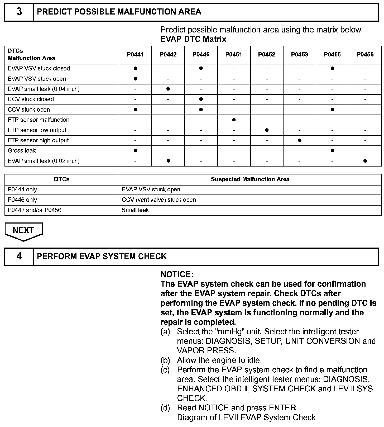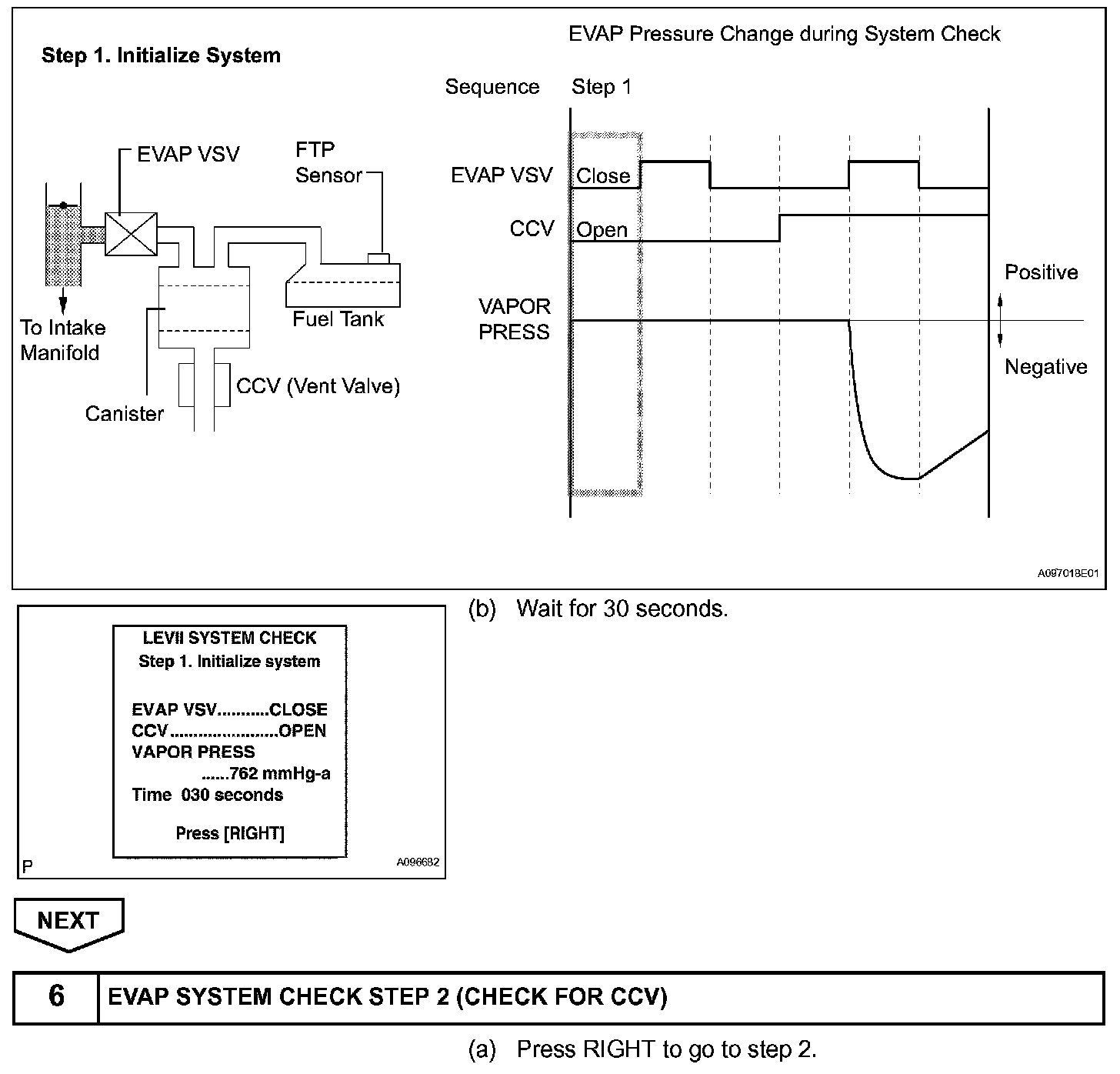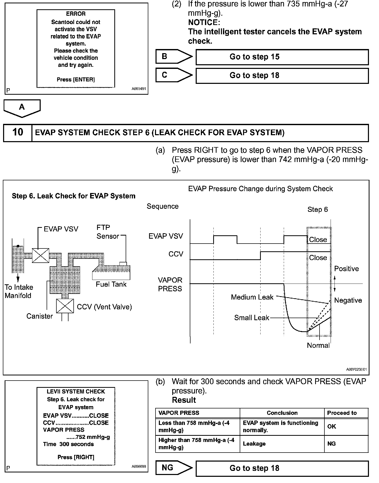 The EVAP monitor's purpose is to check for EVAP leaks and EVAP VSV and CCV malfunctions. The monitor performs the check by first introducing the intake manifold's negative pressure (vacuum) to the EVAP system. Then, the monitor records change in the EVAP system's pressure levels. The monitor runs when the following conditions are met: