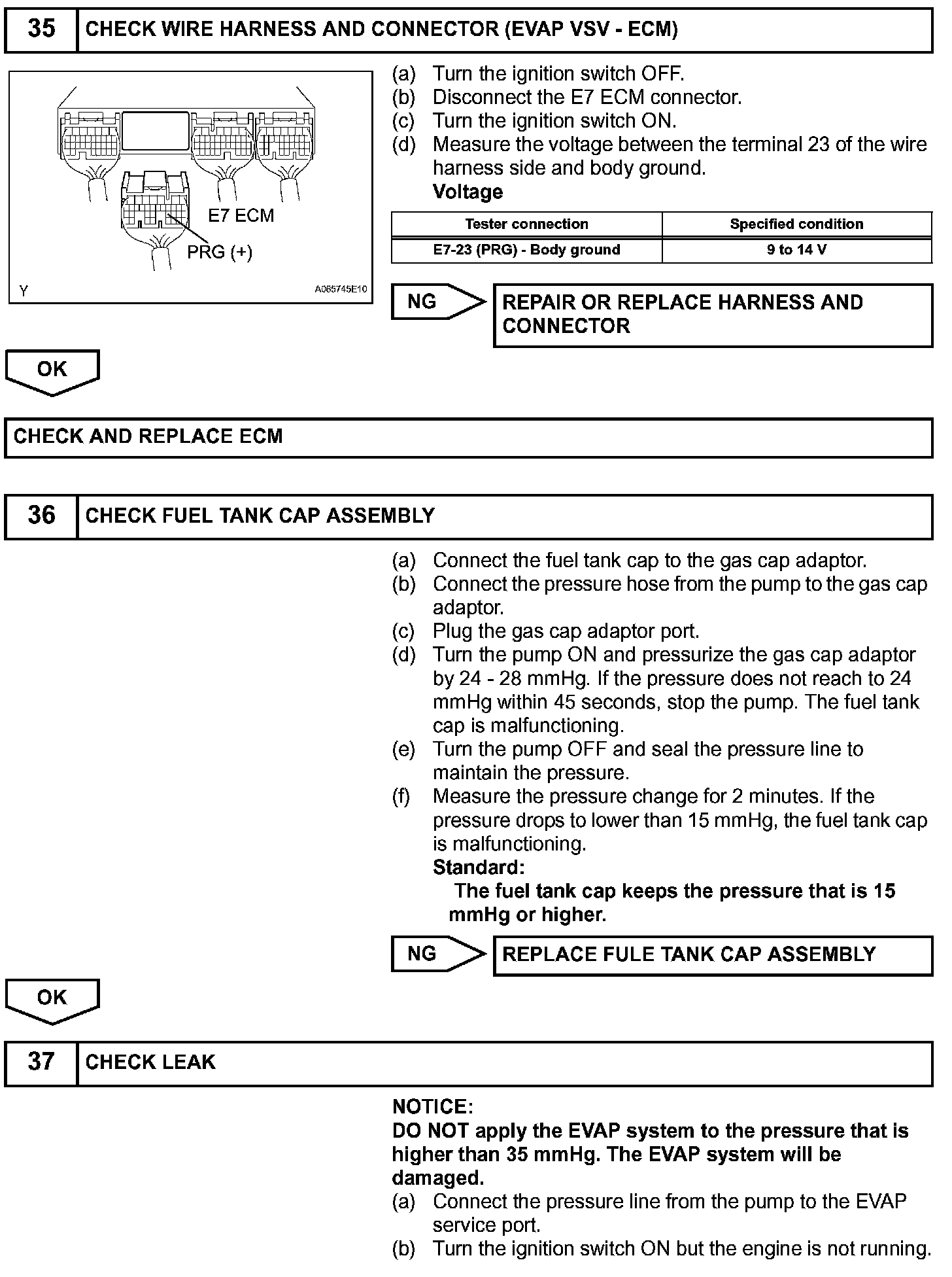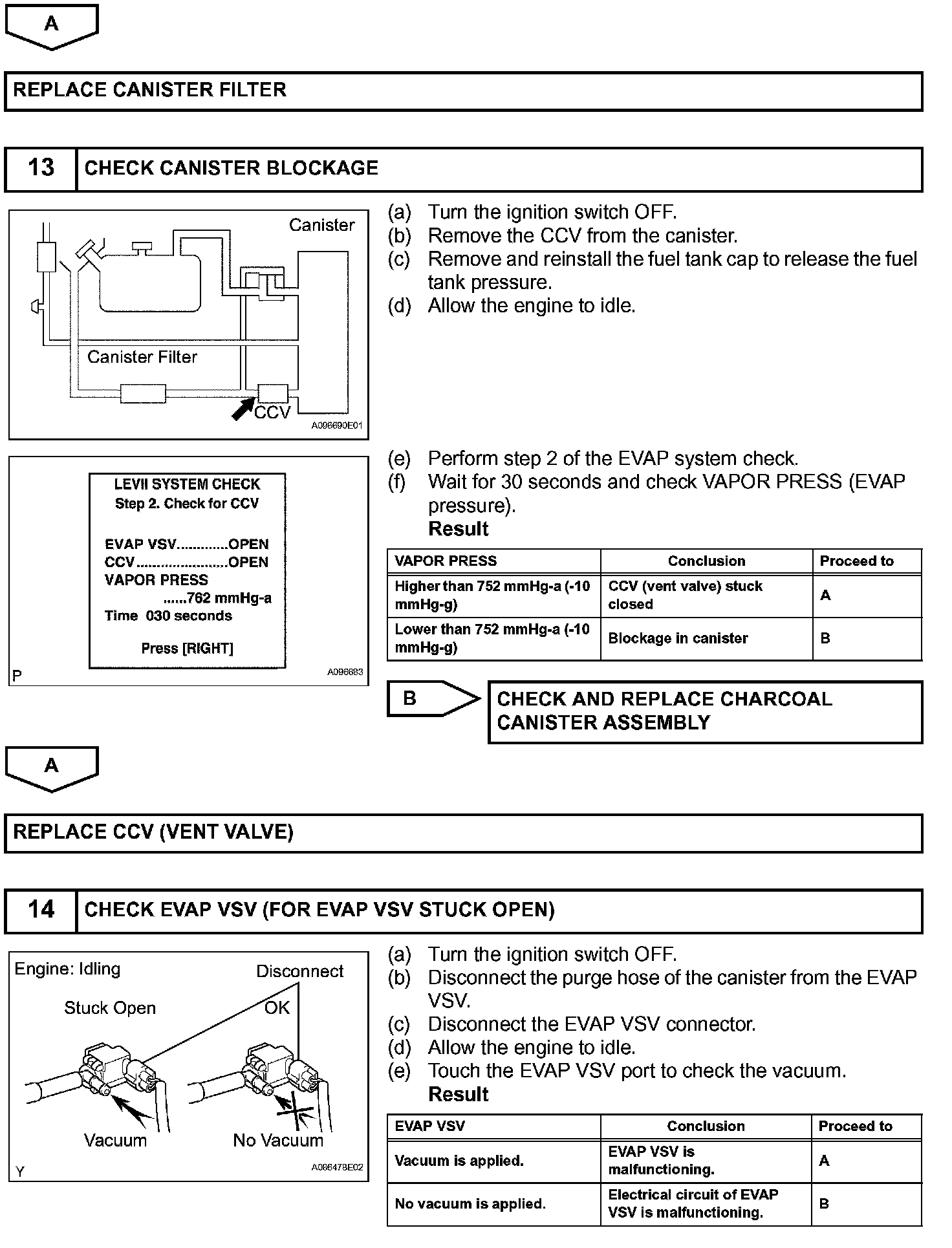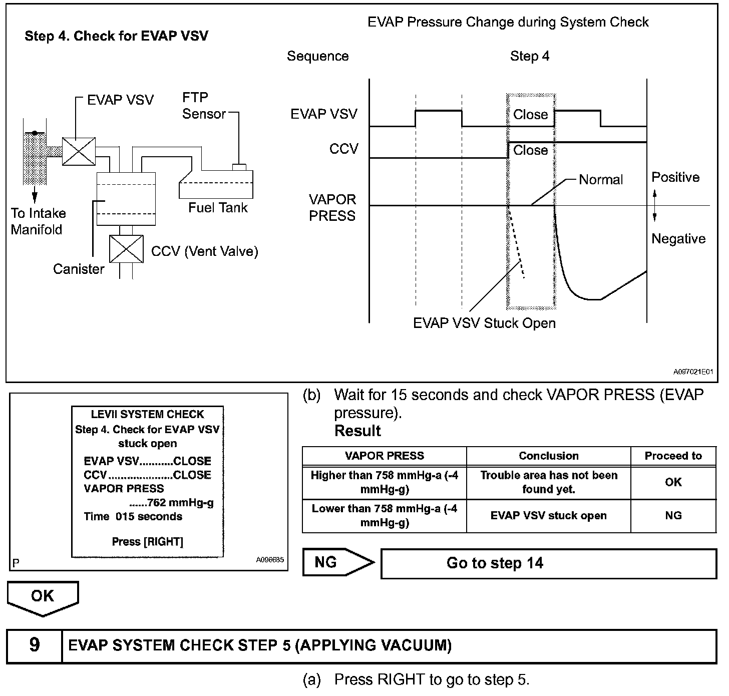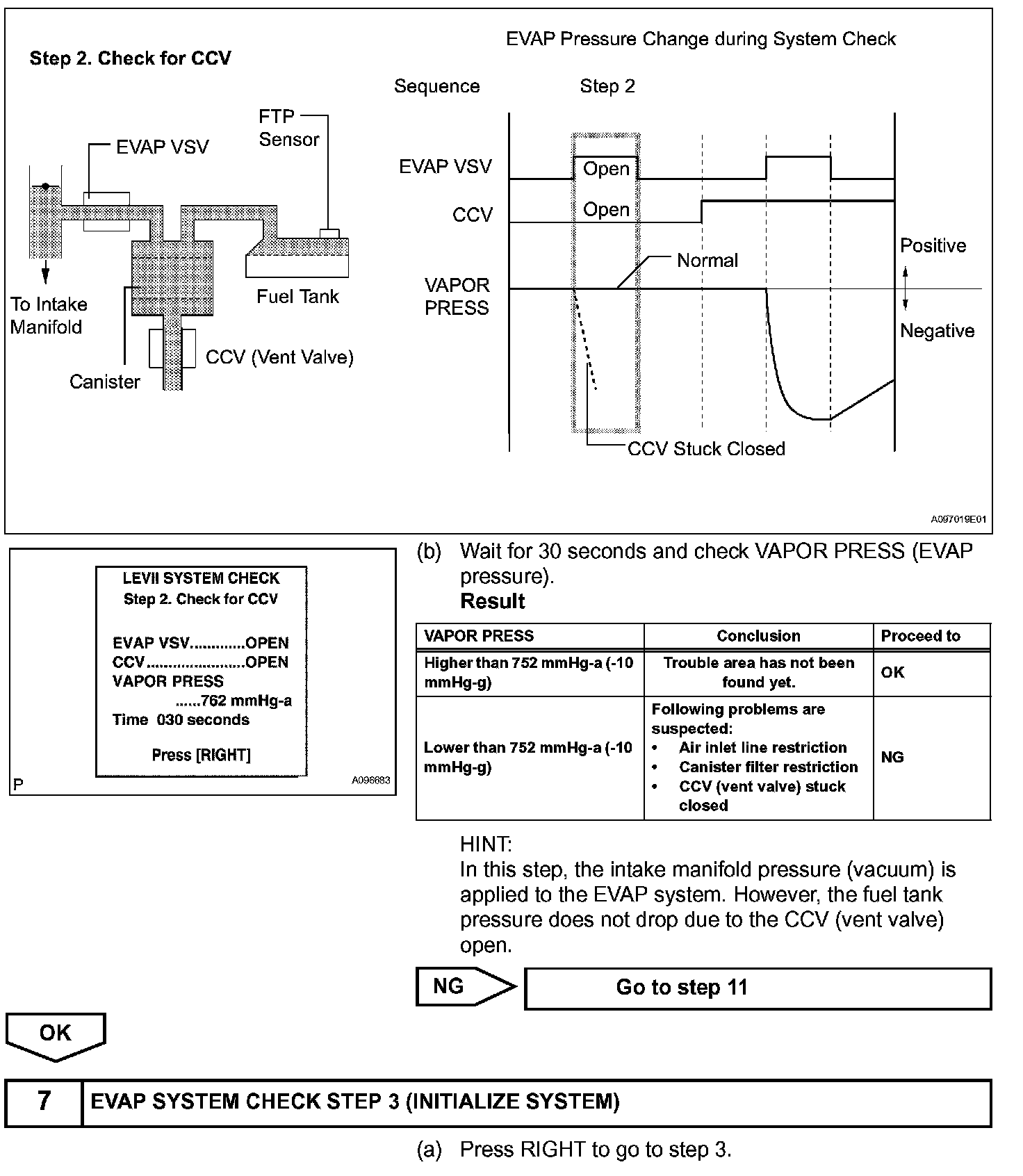 The EVAP monitor's purpose is to check for EVAP leaks and EVAP VSV and CCV malfunctions. The monitor performs the check by first introducing the intake manifold's negative pressure (vacuum) to the EVAP system. Then, the monitor records change in the EVAP system's pressure levels. The monitor runs when the following conditions are met: