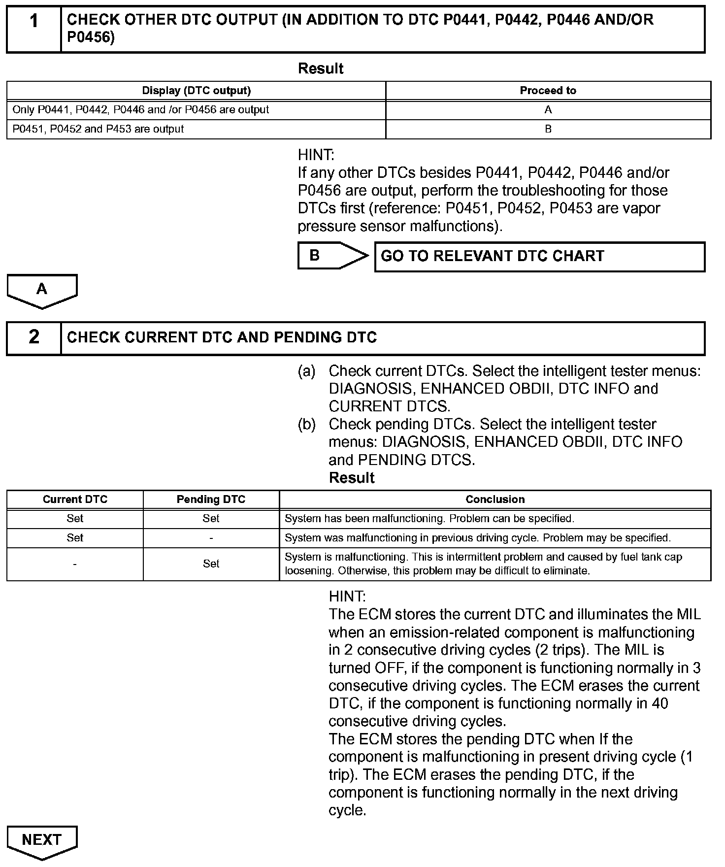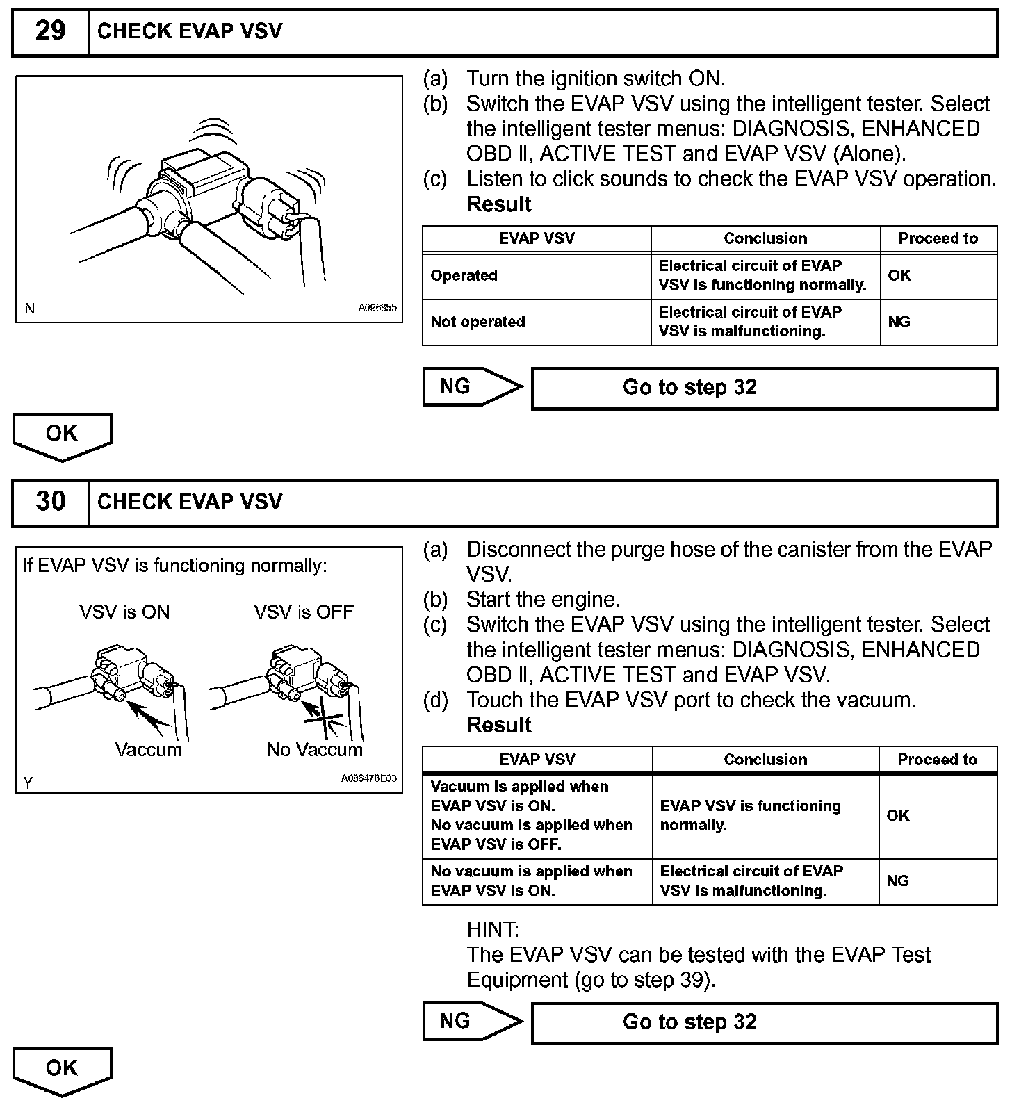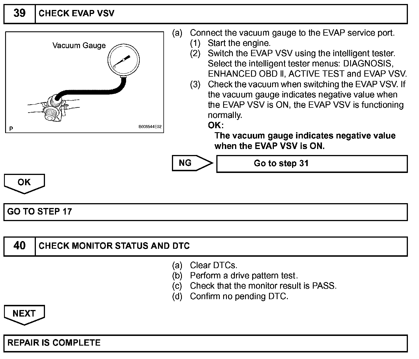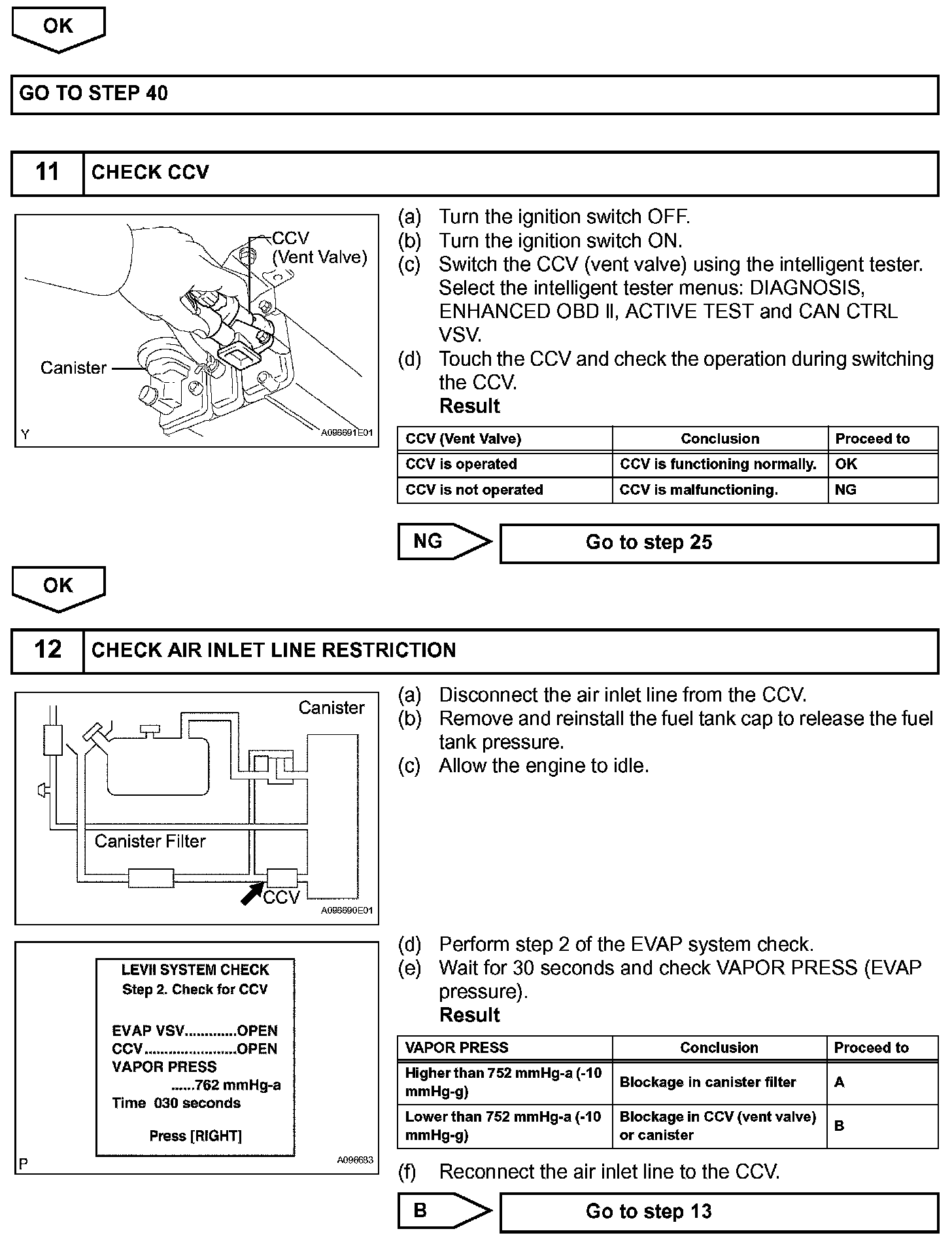 The EVAP monitor's purpose is to check for EVAP leaks and EVAP VSV and CCV malfunctions. The monitor performs the check by first introducing the intake manifold's negative pressure (vacuum) to the EVAP system. Then, the monitor records change in the EVAP system's pressure levels. The monitor runs when the following conditions are met: